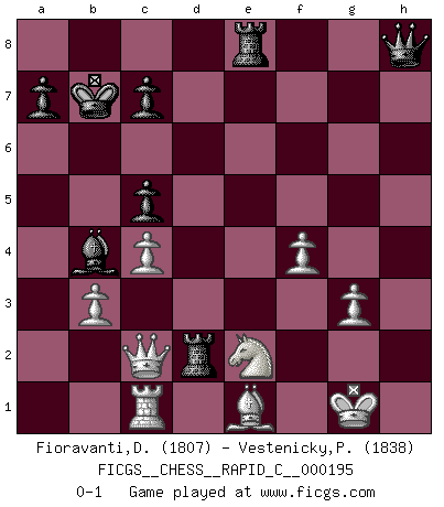 Last move : 0-1 2019 February 4 7:46:38 [Event "FICGS__CHESS__RAPID_C__000195"] [Site "FICGS"] [Date "2018.11.25"] [Round "1"] [White "Fioravanti,Diego"] [Black "Vestenicky,Patrik"] [Result "0-1"] [WhiteElo "1807"] [BlackElo "1838"] 1.e4 e5 2.Nf3 Nc6 3.d4 exd4 4.Nxd4 Nf6 5.Nxc6 bxc6 6.e5 Qe7 7.Qe2 Nd5 8.c4 Ba6 9.b3 O-O-O 10.g3 Qb4+ 11.Bd2 Qb6 12.Bg2 Qd4 13.O-O Qxa1 14.Bxd5 Qxa2 15.Nc3 Qa5 16.Bxf7 Bb4 17.Rc1 Rhf8 18.Bh5 Bb7 19.Be1 g6 20.Bg4 h5 21.Bh3 h4 22.e6 dxe6 23.Qxe6+ Kb8 24.Qxg6 Qe5 25.Bg2 Rfe8 26.Qc2 c5 27.f4 Qh8 28.Bxb7 Kxb7 29.Ne2 hxg3 30.hxg3 Rd2 0-1 Scotch : Mieses variation Queenside Castling by player Black (move 9) Kingside Castling by player White (move 13) Player Black won this chess game. Follow this game move after move (download)Chess is as much a mystery as women. (Purdy) Der 70jährige Viktor Kortschnoi: Die Rentenanstalt wollte mich zwingen in Rente zu gehen. Meine Frau erhält jetzt eine Pension- und ich zahle weiter in die Rentenkasse ein! (Viktor Kortschnoi) Tu sabes, camarada Pachman, no disfruto el ser un Ministro, preferería jugar al Ajedrez como tu. (Che Guevara) Toute estimation doit être constamment réévaluée. (Jacob Estrin) Warrior pose battles inner weakness and wins focus. You see that there is no war within you. You're on your own side, and you are your own strength. (Terri Guillemets)