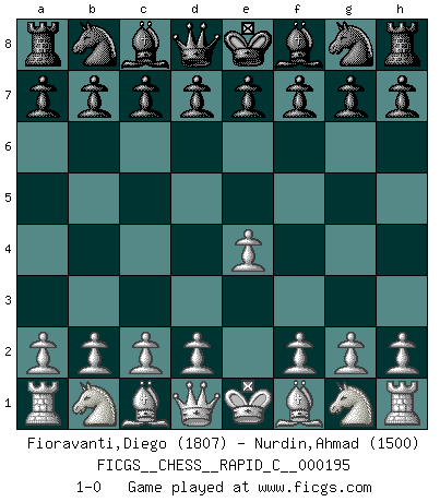 Last move : 1-0 2018 December 26 15:33:10 [Event "FICGS__CHESS__RAPID_C__000195"] [Site "FICGS"] [Date "2018.11.25"] [Round "1"] [White "Fioravanti,Diego"] [Black "Nurdin,Ahmad"] [Result "1-0"] [WhiteElo "1807"] [BlackElo "1500"] 1.e4 1-0 This chess game has been lost on time (started : 2018.11.25 20:31:34) King's pawn Opening Player White won this chess game. Follow this game move after move (download)You are for me the Queen on d8 and I am the Pawn on d7 !! (Eduard Gufeld) Ein Großmeister muß tausende Partien in seinem Kopf speichern, denn diese sind für Ihn, was die Worte der Muttersprache für gewöhnliche Leute sind, oder Noten für Musiker... (Garry Kasparov) Dejen al perfeccionista jugar por correo. (Yasser Seirawan) La victoire dans une partie d'Echecs appartient la plupart du temps à celui qui voit un peu plus loin que l'adversaire. (Lasker) The only thing that overcomes hard luck is hard work. (Harry Golden)