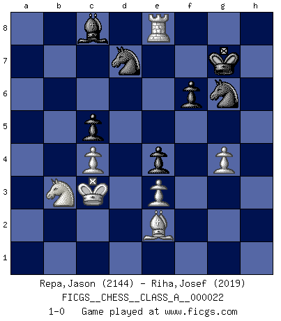 Last move : 1-0 2007 June 24 13:32:14 [Event "FICGS__CHESS__CLASS_A__000022"] [Site "FICGS"] [Date "2007.05.24"] [Round "1"] [White "Repa,Jason"] [Black "Riha,Josef"] [Result "1-0"] [WhiteElo "2144"] [BlackElo "2019"] 1.d4 Nf6 2.Nf3 d5 3.c4 e6 4.Nc3 c6 5.Bg5 Nbd7 6.e3 Qa5 7.cxd5 Nxd5 8.Qd2 Bb4 9.Rc1 h6 10.Bh4 O-O 11.Bd3 e5 12.a3 Bxc3 13.bxc3 Re8 14.c4 Qxd2+ 15.Kxd2 N5b6 16.Be2 e4 17.Ne1 c5 18.d5 Ne5 19.f4 Ng6 20.Bf2 Nd7 21.a4 Ne7 22.g4 Nb6 23.a5 Nd7 24.Nc2 Nb8 25.Bg3 Rd8 26.Rb1 Nec6 27.Bh4 Rd7 28.Rb5 Na6 29.Kc3 Ne7 30.f5 h5 31.h3 f6 32.Bg3 b6 33.axb6 axb6 34.Rxb6 Rxd5 35.Bd6 Rxd6 36.Rxd6 Nb8 37.Ra1 Rxa1 38.Nxa1 hxg4 39.hxg4 Nd7 40.Nb3 g6 41.fxg6 Kg7 42.Re6 Nxg6 43.Re8 1-0 Queen's pawn game Kingside Castling by player Black (move 10) Player White won this chess game. Follow this game move after move (download)If a ruler does not understand Chess, how can he rule over a kingdom ? (King Khusros II) Das Blackmar-Diemer-Gambit verändert den ganzen Menschen! (Emil Joseph Diemer) Yo considero que Fischer es uno de los expertos mas grandes de aperturas de siempre. (Keith Hayward) Demandez au pauvre Cg1 ce qu'il en pense. Eduard Gufeld à propos de la variante Saemisch de l'Est-Indienne. Horse racing is animated roulette. (Roger Kahn)