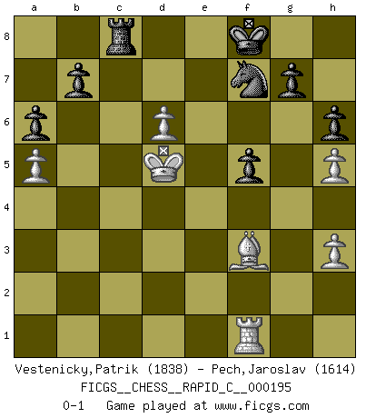 Last move : 0-1 2019 May 24 18:0:5 [Event "FICGS__CHESS__RAPID_C__000195"] [Site "FICGS"] [Date "2018.11.25"] [Round "1"] [White "Vestenicky,Patrik"] [Black "Pech,Jaroslav"] [Result "0-1"] [WhiteElo "1838"] [BlackElo "1614"] 1.e4 c6 2.Nf3 d5 3.exd5 cxd5 4.d4 Nf6 5.Bd3 Bg4 6.Bf4 Nc6 7.c3 e6 8.Nbd2 Nh5 9.Be3 Bd6 10.Qb3 Qc7 11.h3 Bxf3 12.Nxf3 Bf4 13.g4 Bxe3 14.fxe3 Qg3+ 15.Kd2 Qxf3 16.gxh5 Qf2+ 17.Be2 O-O 18.Raf1 Qh4 19.Rf4 Qe7 20.Rg1 f5 21.Rf3 Rab8 22.Qb5 a6 23.Qb6 e5 24.Qc5 Qe6 25.c4 exd4 26.Qxd5 Rbe8 27.Rgf1 dxe3+ 28.Rxe3 Qxd5+ 29.cxd5 Ne5 30.Kd1 h6 31.a4 Nc4 32.Rxe8 Nxb2+ 33.Kd2 Rxe8 34.a5 Re5 35.Bf3 Nc4+ 36.Kd3 Nd6 37.Kd4 Re8 38.Kc5 Nf7 39.d6 Rc8+ 40.Kd5 Kf8 0-1 Caro-Kann defense Kingside Castling by player Black (move 17) Player Black won this chess game. Follow this game move after move (download)When you are lonely, when you feel yourself an alien in the world, play Chess. This will raise your spirits and be your counselor in war. (Aristotle) Wie bekannt hörte Morphy 1859 auf, Schach zu spielen. Seine Enttäuschung galt nicht so sehr dem Schach, wie den Schachspielern. (Robert James Fischer) Debemos de asegurarnos de que el Ajedrez no se convierta en un lenguaje muerto, muy interesante, pero tan solo para un grupo muy pequeño. (Sytze Faber) Mais n'est-ce pas déjà le limiter injurieusement que d'appeler les échecs un jeu? N'est-ce pas aussi une science, un art, ou quelque chose qui, comme le cercueil de Mahomet entre ciel et terre, est suspendu entre l'un et l'autre, et qui réunit un nombre incroyable de contraires ? (Stefan Zweig) I know the human being and fish can coexist peacefully. (George W. Bush, Saginaw sept. 29, 2000)