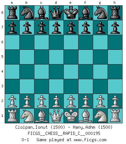 Last move : 0-1 2018 December 26 3:26:3 [Event "FICGS__CHESS__RAPID_C__000195"] [Site "FICGS"] [Date "2018.11.25"] [Round "1"] [White "Ciolpan,Ionut"] [Black "Hany,Adhm"] [Result "0-1"] [WhiteElo "1500"] [BlackElo "1500"] 0-1 This chess game has been lost on time (started : 2018.11.25 20:31:34) Player Black won this chess game. Follow this game move after move (download)In Fischer's hands, a slight theoretical advantage is as good a being a Queen ahead. (Isaac Kashdan) Modernes Schach sorgt sich zuviel um Dinge wie Bauernstruktur usw. Vergessen Sie das, Schachmatt beendet das Spiel! (Nigel Short) Hay jugadores fuertes y personas amables y yo soy un jugador fuerte. (Bobby Fischer) Dans le domaine de la peinture, de la gravure et de la sculpture, dès la première décennie de notre siècle, les artistes abandonnent la représentation de la partie d'échecs pour se concentrer sur les pièces, sur les échiquiers et sur toutes les variations auxquelles les unes et les autres peuvent donner lieu. On passe en quelque sorte d'un thème social à un thème musical (au sens de la musica médiévale, c'est-à-dire d'une notion qui inclue le rythme, l'harmonie, la construction et la déconstruction, etc.). Graphiquement et picturalement, l'échiquier apparaît comme une structure ouverte, dynamique, d'une richesse infinie, autorisant toutes les combinatoires et débouchant sur des mouvements et des rythmes de nature exponentielle. (Michel Pastoureau) There is a computer disease that anybody who works with computers knows about. It's a very serious disease and it interferes completely with the work. The trouble with computers is that you 'play' with them ! (Richard P. Feynman)