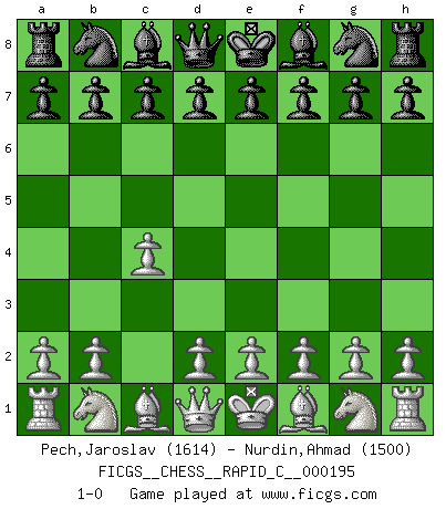 Last move : 1-0 2018 December 27 3:32:12 [Event "FICGS__CHESS__RAPID_C__000195"] [Site "FICGS"] [Date "2018.11.25"] [Round "1"] [White "Pech,Jaroslav"] [Black "Nurdin,Ahmad"] [Result "1-0"] [WhiteElo "1614"] [BlackElo "1500"] 1.c4 1-0 This chess game has been lost on time (started : 2018.11.25 20:31:34) English Opening Player White won this chess game. Follow this game move after move (download)Every Pawn is a potential Queen. (James Mason) Gewinnen beim Schach fördert das Selbstvertrauen. Beim Sex spüre ich sowas nicht... (Garry Kasparov) Tu puedes aprender mucho mas de una partida que pierdas que de una partida ganada. Tendras que perder cientos de partidas antes de llegar a ser un buen jugador. (Jose Raul Capablanca) Vouloir jouer aux échecs contre soi-même est aussi paradoxal que vouloir marcher sur son ombre. (Stefan Zweig) Who needs drugs and alcohol if he can play Big Chess at FICGS ? (Heinz-Georg Lehnhoff)