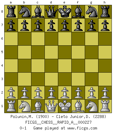 Last move : 0-1 2018 December 26 15:33:10 [Event "FICGS__CHESS__RAPID_A__000227"] [Site "FICGS"] [Date "2018.11.26"] [Round "1"] [White "Polunin,Morphyria"] [Black "Cleto Junior,Dirceu"] [Result "0-1"] [WhiteElo "1900"] [BlackElo "2288"] 0-1 This chess game has been lost on time (started : 2018.11.26 8:44:37) Player Black won this chess game. Follow this game move after move (download)During a Chess competition a Chessmaster should be a combination of a beast of prey and a monk. (Alexander Alekhine) Die FIDE ist dabei in die Hände der russischen Mafia zu fallen. (Larry Evans) Las ideas audaces son como las piezas del Ajedrez que avanzan hacia adelante. Ellas pueden ser vencidas, pero también pueden iniciar una partida victoriosa. (Goethe) Ce n'est pas pour s'amuser qu'il joue aux échecs : il célèbre un culte. (Vladimir Nabokov) I couldn't make any sense out of what this particular thread is about. It sounds like R2 D2 computer speaking. A space fight ?!? Some 'command' problems in Moscow ? Some killers & narcotic addicts attacking some game & a god wannabe ?? (Dinesh De Silva, lost in a russian conflict in FICGS forum)