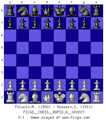 Last move : 0-1 2018 December 26 15:33:10 [Event "FICGS__CHESS__RAPID_A__000227"] [Site "FICGS"] [Date "2018.11.26"] [Round "1"] [White "Polunin,Morphyria"] [Black "Hussain,Sakhawat"] [Result "0-1"] [WhiteElo "1900"] [BlackElo "1911"] 0-1 This chess game has been lost on time (started : 2018.11.26 8:44:37) Player Black won this chess game. Follow this game move after move (download)No price is too great for the scalp of the enemy King. (Koblentz) Unter Putin wird alles Geld aus Russland wie von einem Staubsauger nach Moskau umgeleitet, das ist wie ein schwarzes Loch. (Garry Kasparov) El Peón aislado arroja penumbra sobre todo el tablero. (Aaron Nimzovich) La vie est comme un jeu d'échecs : nous esquissons un plan, mais celui-ci est tributaire de ce que daignent faire l'adversaire aux échecs et le destin dans la vie. (Arthur Schopenhauer) Players are not good because they find tactics, it is about the way to find the positions in which those tactics are hidden. (Luc-Olivier Leclerc)