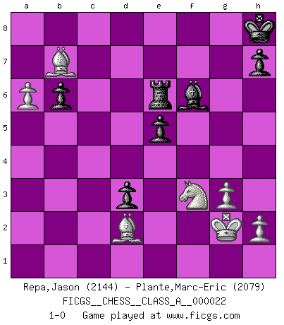 Last move : 1-0 2008 January 3 5:0:2 [Event "FICGS__CHESS__CLASS_A__000022"] [Site "FICGS"] [Date "2007.05.24"] [Round "1"] [White "Repa,Jason"] [Black "Plante,Marc-Eric"] [Result "1-0"] [WhiteElo "2144"] [BlackElo "2079"] 1.d4 Nf6 2.c4 g6 3.Nc3 Bg7 4.e4 d6 5.Nf3 O-O 6.Be2 e5 7.O-O Nc6 8.d5 Ne7 9.b4 Nh5 10.Re1 f5 11.Ng5 Nf6 12.f3 Nh5 13.c5 Nf4 14.Bc4 Kh8 15.Rb1 fxe4 16.Ngxe4 Nf5 17.g3 Nh3+ 18.Kg2 Nd4 19.Rf1 Bf5 20.Nb5 g5 21.cxd6 Nxb5 22.Bxb5 cxd6 23.Be3 g4 24.Bd3 Qd7 25.Rc1 gxf3+ 26.Rxf3 Bg4 27.Be2 Bf5 28.Rxf5 Qxf5 29.Bf3 Rfd8 30.Bd2 Rf8 31.Qe2 Qf7 32.a4 Rad8 33.Bh5 Qxd5 34.Kxh3 Rc8 35.Rxc8 Rxc8 36.Bg4 Rf8 37.Ng5 Rf6 38.Bf3 Qg8 39.Bxb7 d5 40.Qd3 d4 41.Qe4 Rh6+ 42.Kg2 Qa2 43.Nf3 Rd6 44.b5 Bf6 45.a5 d3 46.Qf5 Qe6 47.Qxe6 Rxe6 48.b6 axb6 49.a6 1-0 King's Indian : Orthodox, Aronin-Taimanov variation (Yugoslav attack / Mar del Plata variation) Kingside Castling by player Black (move 5) Kingside Castling by player White (move 7) Player White won this chess game. Follow this game move after move (download)Fischer wanted to give the Russians a taste of their own medicine. (Larry Evans) Offener Brief an US-Präsident Bush anlässlich der Verhaftung Bobby Fishers: Verhaften Sie mich. Stecken Sie mich in dieselbe Zelle wie Bobby Fisher und geben Sie uns ein Schachspiel mit. (Boris Vassilievich Spassky) Yo adoro todas la posiciones. Denme una partida posicional difícil, y la jugaré. Pero posiciones totalmente ganadas, no las tolero. (Hein Donner) La guerre est enfant de la passion, la passion est enfant du narcissisme et le narcissisme est l'enfant. (...) Une autre partie ? (Thibault de Vassal) The arrogant army will lose certainly the battle. (Chinese proverb)