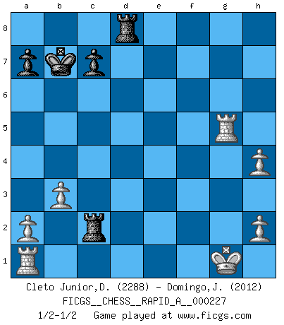 Last move : 1/2-1/2 2019 February 9 21:46:18 [Event "FICGS__CHESS__RAPID_A__000227"] [Site "FICGS"] [Date "2018.11.26"] [Round "1"] [White "Cleto Junior,Dirceu"] [Black "Domingo,Jordi"] [Result "1/2-1/2"] [WhiteElo "2288"] [BlackElo "2012"] 1.e4 e5 2.Nf3 d6 3.d4 exd4 4.Nxd4 Nf6 5.Nc3 Be7 6.g3 d5 7.e5 Ne4 8.Nxe4 dxe4 9.Bg2 Qd5 10.O-O Nc6 11.c3 Nxd4 12.Qxd4 Qxd4 13.cxd4 Bf5 14.f3 exf3 15.Bxf3 O-O-O 16.Bxb7+ Kxb7 17.Rxf5 Rxd4 18.Be3 Re4 19.Rxf7 Rxe5 20.Bd4 Bc5 21.Bxc5 Rxc5 22.Rxg7 Rc2 23.b3 h5 24.Rg6 Rd8 25.Rg5 h4 26.gxh4 1/2-1/2 Philidor : Exchange variation Kingside Castling by player White (move 10) Queenside Castling by player Black (move 15) This chess game ended in a draw. Follow this game move after move (download)Many Chess players were surprised when after the game, Fischer quietly explained: 'I had already analyzed this possibility' in a position which I thought was not possible to foresee from the opening. (Mikhail Tal) Kleine Schachspieler machen Mist, und große Schachspieler machen Mist, aber große machen weniger Mist. (Fritz Sämisch) Nada excita más a Grandes Maestros aburridos que una novedad teórica. (Dominic Lawson) Le jeu d'échecs est comme rejeté hors du temps. (Antoine de Saint-Exupéry) Pretend inferiority and encourage his arrogance. (Sun Tzu)