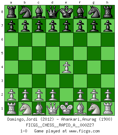 Last move : 1-0 2018 December 27 3:32:12 [Event "FICGS__CHESS__RAPID_A__000227"] [Site "FICGS"] [Date "2018.11.26"] [Round "1"] [White "Domingo,Jordi"] [Black "Ahankari,Anurag"] [Result "1-0"] [WhiteElo "2012"] [BlackElo "1900"] 1.e4 1-0 This chess game has been lost on time (started : 2018.11.26 8:44:37) King's pawn Opening Player White won this chess game. Follow this game move after move (download)Chess is the art of analysis. (Mikhail Botvinnik) Sitze auf Deine Hände. (Siegbert Tarrasch) Un jugador que es sorprendido, esta derrotado a medias. (Proverbio) Karpov est une pièce de musée. (Garry Kasparov) Life is pleasant. Death is peaceful. It's the transition that's troublesome. (Isaac Asimov)