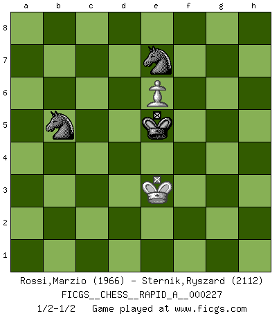 Last move : 1/2-1/2 2019 March 7 12:57:27 [Event "FICGS__CHESS__RAPID_A__000227"] [Site "FICGS"] [Date "2018.11.26"] [Round "1"] [White "Rossi,Marzio"] [Black "Sternik,Ryszard"] [Result "1/2-1/2"] [WhiteElo "1966"] [BlackElo "2112"] 1.e4 c5 2.b4 cxb4 3.a3 e5 4.axb4 Bxb4 5.c3 Be7 6.d4 exd4 7.cxd4 d5 8.e5 Nc6 9.Nf3 Bb4+ 10.Bd2 Nge7 11.Be2 a5 12.Bxb4 Nxb4 13.O-O Bd7 14.Nc3 O-O 15.Qd2 Rc8 16.Rfc1 Ng6 17.h4 Bg4 18.g3 Qb6 19.Na4 Qe6 20.Nc5 Qf5 21.Ne1 Bxe2 22.Qxe2 b6 23.Nb7 Rc6 24.Nd6 Qe6 25.Rxc6 Nxc6 26.Nb5 f6 27.Nd3 h5 28.Re1 fxe5 29.dxe5 Qg4 30.e6 Qxe2 31.Rxe2 Rc8 32.Rc2 Nce7 33.Rxc8 Nxc8 34.Nc7 Nge7 35.Kf1 Nd6 36.Ke2 a4 37.Nb4 a3 38.Kd3 Ne4 39.Kc2 d4 40.Nb5 Nxf2 41.Nxa3 g6 42.Nc4 Kg7 43.Nxb6 Kf6 44.Kd2 Nh1 45.Kd3 Nxg3 46.Kxd4 Ngf5+ 47.Ke4 Nxh4 48.Nd3 g5 49.Nd7 Kg6 50.Nf2 Nhf5 51.Nh3 g4 52.Nf4 Kg5 53.Nxh5 Kxh5 54.Nf6 Kh4 55.Nxg4 Kxg4 56.Kd3 Kf4 57.Kd2 Nd6 58.Kd3 Ke5 59.Ke3 Nb5 60.Kd3 Nc7 61.Ke3 Nb5 1/2-1/2 Sicilian : wing gambit, Marshall variation Kingside Castling by player White (move 13) Kingside Castling by player Black (move 14) 10 pieces endgame at move 46 : White KNNPP , Black KNNPP WHITE : King + 2 Knights 2 Pawns BLACK : King + 2 Knights 2 Pawns 9 pieces endgame at move 47 : White KNNP , Black KNNPP WHITE : King + 2 Knights 1 Pawn BLACK : King + 2 Knights 2 Pawns 8 pieces endgame at move 53 : White KNNP , Black KNNP WHITE : King + 2 Knights 1 Pawn BLACK : King + 2 Knights 1 Pawn 7 pieces endgame at move 53 : White KNP , Black KNNP WHITE : King + 1 Knight 1 Pawn BLACK : King + 2 Knights 1 Pawn 6 pieces endgame at move 55 : White KNP , Black KNN WHITE : King + 1 Knight 1 Pawn BLACK : King + 2 Knights 5 pieces endgame at move 55 : White KP , Black KNN WHITE : King + 1 Pawn BLACK : King + 2 Knights This chess game ended in a draw. Follow this game move after move (download)The Pin is mightier than the sword. (Fred Reinfeld) Viele Opfer benötigen überhaupt keine konkrete Berechnung. Es genügt sich die entstehende Position kurz vorzustellen, um uns davon zu überzeugen, dass das Opfer korrekt ist. (Mikhail Nekhemyevich Tal) El Peón aislado arroja penumbra sobre todo el tablero. (Aaron Nimzovich) À la honte des hommes, on sait que les lois du jeu sont les seules qui soient partout justes, claires, inviolables et exécutées. Pourquoi l'Indien qui a donné les règles du jeu d'échecs est-il obéi de bon gré dans toute la terre, et que les décrétales des papes, par exemple, sont aujourd'hui un objet d'horreur et de mépris ? C'est que l'inventeur des échecs combina tout avec justesse pour la satisfaction des joueurs, et que les papes, dans leurs décrétales, n'eurent en vue que leur seul avantage. L'Indien voulut exercer également l'esprit des hommes et leur donner du plaisir; les papes ont voulu abrutir l'esprit des hommes. Voltaire (Dictionnaire philosophique / Garnier 1967) Inventor: A person who makes an ingenious arrangement of wheels, levers and springs, and believes it civilization. (Ambrose Bierce, The Devil's Dictionary)