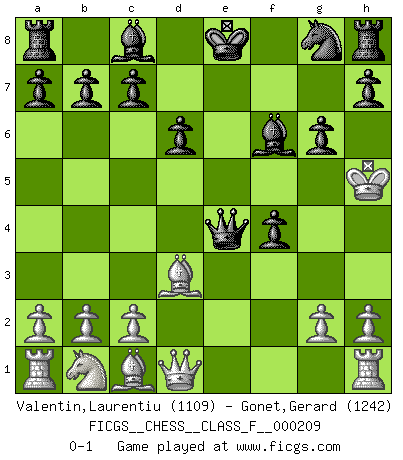 Last move : 0-1 2018 December 6 11:35:58 [Event "FICGS__CHESS__CLASS_F__000209"] [Site "FICGS"] [Date "2018.11.26"] [Round "1"] [White "Valentin,Laurentiu"] [Black "Gonet,Gerard"] [Result "0-1"] [WhiteElo "1109"] [BlackElo "1242"] 1.e4 e5 2.f4 Nc6 3.Nf3 f5 4.Nxe5 Nxe5 5.fxe5 Qh4+ 6.Ke2 Qxe4+ 7.Kf2 Bc5+ 8.d4 Bxd4+ 9.Kg3 Bxe5+ 10.Kh3 f4 11.Bd3 d6 12.Kh4 Bf6+ 13.Kh5 g6+ 0-1 King's gambit Player Black won this chess game. Follow this game move after move (download)I know people who have all the will in the world, but still can't play good Chess. (Bobby Fischer) Ich moechte nie einem Club beitreten, der Leute wie mich als Mitglieder aufnimmt. (Woody Allen) Una clavada es mas poderosa que una espada. (Fred Reinfeld) Aux échecs, l'amour-propre est satisfait quand on remporte la victoire, mais il n'y a pas de honte à être battu. (Benjamin Franklin) The only thing that matters is the evidence. (Horatio Caine, C.S.I. Miami)