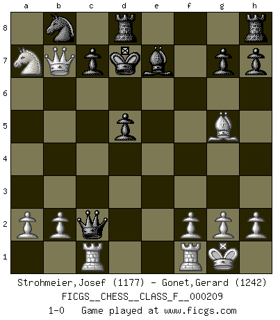 Last move : 1-0 2019 January 12 11:15:23 [Event "FICGS__CHESS__CLASS_F__000209"] [Site "FICGS"] [Date "2018.11.26"] [Round "1"] [White "Strohmeier,Josef"] [Black "Gonet,Gerard"] [Result "1-0"] [WhiteElo "1177"] [BlackElo "1242"] 1.e4 e5 2.Nf3 f5 3.Nc3 Nc6 4.exf5 Nf6 5.Bc4 d5 6.Bb5 e4 7.Nd4 Bd7 8.O-O Nxd4 9.Bxd7+ Qxd7 10.d3 Qxf5 11.dxe4 Qg6 12.Qxd4 O-O-O 13.Qxa7 Nd7 14.Qa8+ Nb8 15.Nb5 Qxe4 16.Na7+ Kd7 17.Qxb7 Qxc2 18.Bg5 Be7 19.Rac1 1-0 Latvian counter-gambit Kingside Castling by player White (move 8) Queenside Castling by player Black (move 12) Player White won this chess game. Follow this game move after move (download)You know you're going to lose. Even when I was ahead I knew I was going to lose. - On playing against Fischer. (Andrew Soltis) Es tut gut, die Entwicklungsperiode von, [...] demokratischem Geist durchdringen zu lassen. Wie undemokratisch wäre es doch beispielsweise, den einen Offizier große Spaziertouren vornehmen zu lassen, während die anderen zu Hause säßen und sich entsetzlich langweilten. (Aaron Nimzowitsch) La vida es como el Ajedrez, con lucha, competición y eventos buenos y malos. (Benjamin Franklin) Vous m'avez demandé de vous exposer quel est le fondement de la prière. Je ne fais que préparer les pièces du jeu sur la table... Nous sera-t-il permis d'en adopter les règles et si nous les appliquons scrupuleusement nous ne tarderons pas à faire mat le Roi divin ! Il ne pourra échapper à nos mains. (Sainte Thérèse d'Avila, Chemin de perfection) Follow your passion, and success will follow you. (Arthur Buddhold)