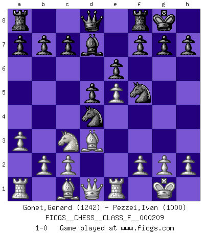 Last move : 1-0 2019 February 7 19:35:15 [Event "FICGS__CHESS__CLASS_F__000209"] [Site "FICGS"] [Date "2018.11.26"] [Round "1"] [White "Gonet,Gerard"] [Black "Pezzei,Ivan"] [Result "1-0"] [WhiteElo "1242"] [BlackElo "1000"] 1.d4 d5 2.e4 Nc6 3.Nc3 e6 4.e5 Bb4 5.Nge2 Nge7 6.a3 Bxc3+ 7.Nxc3 O-O 8.Be2 Bd7 9.O-O Nf5 10.Re1 Ncxd4 11.Bd3 1-0 Blackmar gambit Kingside Castling by player Black (move 7) Kingside Castling by player White (move 9) Player White won this chess game. Follow this game move after move (download)Chess is a terrific way for kids to build self image and self esteem. (Saudin Robovic) Mein Name ist Rustam Kamsky. Sie haben meinen Sohn belästigt. Bereiten Sie sich aufs Sterben vor. (Rustam Kamsky) Todavía soy una víctima del Ajedrez. Tiene toda la belleza del arte y mucho mas. No puede ser comercializado. El Ajedrez es mas puro que el arte en su posición social. (Marcel Duchamp) Des points faibles ou des trous dans la position de l'adversaire doivent être occupés par des pièces et non pas par des pions. (Siegbert Tarrasch) Work expands to fill the time available. (C. Northcote Parkinson, in Parkinson's Laws)