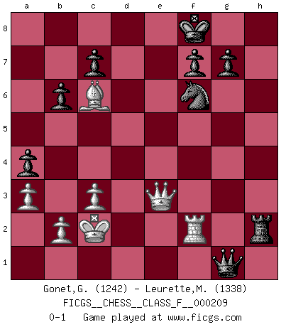Last move : 0-1 2018 December 3 13:36:45 [Event "FICGS__CHESS__CLASS_F__000209"] [Site "FICGS"] [Date "2018.11.26"] [Round "1"] [White "Gonet,Gerard"] [Black "Leurette,Marc-Antoine"] [Result "0-1"] [WhiteElo "1242"] [BlackElo "1338"] 1.d4 d5 2.e4 dxe4 3.Nc3 Nf6 4.f3 exf3 5.Qxf3 e6 6.Be3 Nc6 7.O-O-O b6 8.Qxc6+ Bd7 9.Qf3 Be7 10.Bd3 a5 11.Nh3 a4 12.a3 Bc6 13.Ne4 Bxe4 14.Bxe4 Rb8 15.Rhf1 h6 16.Bc6+ Kf8 17.g4 Qd6 18.Bf4 Qd8 19.g5 hxg5 20.Nxg5 Bd6 21.Nh3 Bxf4+ 22.Nxf4 Rh6 23.Nh5 Qe7 24.Rde1 Rd8 25.c3 Nxh5 26.Re5 Nf6 27.d5 Rd6 28.dxe6 Rxe6 29.Rxe6 Qxe6 30.Rf2 Qg4 31.Qe3 Qg1+ 32.Kc2 Rxh2 0-1 Blackmar gambit Queenside Castling by player White (move 7) Player Black won this chess game. Follow this game move after move (download)With or without the title, Bobby Fischer was unquestionably the greatest player of his time. (Burt Hochberg) Man braucht nicht immer den besten Zug zu spielen: Ein Zug muß aktiv, unternehmungslustig, korrekt und schön sein. (David Bronstein) El Ajedrez demanda una total concentración. (Bobby Fischer) Pour se monter efficace, un Cavalier a besoin d'avant-postes ! Les Cavaliers font les meilleurs bloqueurs de pions passés. You can only get smarter by playing a smarter opponent. (Revolver, movie)