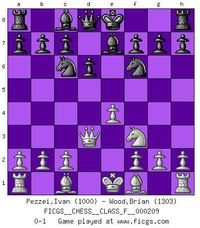 Last move : 0-1 2019 January 14 5:38:25 [Event "FICGS__CHESS__CLASS_F__000209"] [Site "FICGS"] [Date "2018.11.26"] [Round "1"] [White "Pezzei,Ivan"] [Black "Wood,Brian"] [Result "0-1"] [WhiteElo "1000"] [BlackElo "1303"] 1.e4 e5 2.d4 exd4 3.Qxd4 Nc6 4.Qe3 d6 5.Nf3 Nf6 6.Nc3 Be7 7.Nd5 Nxd5 8.Qd3 Nf6 0-1 This chess game has been lost on time (started : 2018.11.26 15:34:56) Centre game : Paulsen attack Player Black won this chess game. Follow this game move after move (download)I don't believe in psychology. I believe in good moves. (Bobby Fischer) Schachspieler können ausgezeichnet Varianten am Schachbrett berechnen, aber nicht im realen Leben. Zu stark ist der Individualismus im Schach ausgeprägt, und für viele ist ein kleiner momentaner persönlicher Vorteil wichtiger als ein weit größerer Vorteil von morgen. (Anatoly Karpov) Alekhine es un poeta que crea un trabajo de arte de algo que raramente inspiraría a otra persona a mandar una tarjeta postal. (Max Euwe) Donnez-moi un Cavalier en 6e et je gagnerais toutes mes parties. (Steinitz) Always be a first-rate version of yourself, instead of a second-rate version of somebody else. (Judy Garland)