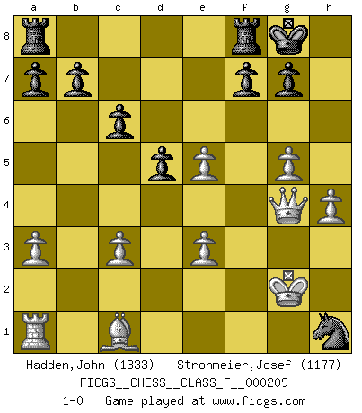 Last move : 1-0 2019 January 20 12:26:24 [Event "FICGS__CHESS__CLASS_F__000209"] [Site "FICGS"] [Date "2018.11.26"] [Round "1"] [White "Hadden,John"] [Black "Strohmeier,Josef"] [Result "1-0"] [WhiteElo "1333"] [BlackElo "1177"] 1.d4 d5 2.c4 e6 3.cxd5 exd5 4.Nc3 Nf6 5.Nf3 c6 6.e3 Bb4 7.a3 Bxc3+ 8.bxc3 O-O 9.Bd3 Bg4 10.h3 Bh5 11.g4 Bg6 12.Ne5 Bxd3 13.Qxd3 h6 14.f4 Nbd7 15.g5 hxg5 16.fxg5 Ne4 17.h4 Nxe5 18.dxe5 Qe7 19.Qd4 Qe6 20.Ke2 Ng3+ 21.Kf2 Nxh1+ 22.Kg2 Qg4+ 23.Qxg4 1-0 Queen's gambit declined Kingside Castling by player Black (move 8) Player White won this chess game. Follow this game move after move (download)Chess is a more highly symbolic game, but the aggressions are therefore even more frankly represented in the play. It probably began as a war game; that is, the representation of a miniature battle between the forces of two kingdoms. (Karl Meninger) Bis zum Jahr 1971 verlief in meiner Schachkariere alles glatt. Dieses dramatische Match [Fischer-Taimanov 6:0] machte mein Leben zur Hölle. (Mark Taimanov) Bobby Fischer es el jugador de Ajedrez mas grande que jamás haya existido. (Ken Smith) La vérité est comme le meilleur coup aux échecs : elle existe, mais il faut la chercher. (Arturo Perez-Reverte) If you lose the game you should win the analysis! (Proverb)