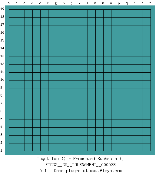 Last move : 0-1 2018 December 27 15:31:30 [Event "FICGS__GO__TOURNAMENT__000028"] [Site "FICGS"] [Date "2018.11.27"] [Round "1"] [Black "Tuyet,Tan"] [White "Premsawad,Suphasin"] [Result "0-1"] 0-1 This go game has been lost on time (started : 2018.11.27 14:20:19) Here are the names of the openings (joseki) played in the four corners : Player White won this Go (weiqi, baduk) game. Follow this game move after move (download)One point in the center is worth ten in the corner. (Anonymous) You must do what you feel is right... of course. (Obi-Wan Kenobi in Star Wars ep.4)