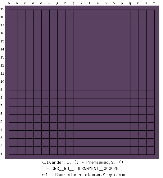 Last move : 0-1 2018 December 27 15:31:30 [Event "FICGS__GO__TOURNAMENT__000028"] [Site "FICGS"] [Date "2018.11.27"] [Round "1"] [Black "Kilvander,Elsa"] [White "Premsawad,Suphasin"] [Result "0-1"] 0-1 This go game has been lost on time (started : 2018.11.27 14:20:19) Here are the names of the openings (joseki) played in the four corners : Player White won this Go (weiqi, baduk) game. Follow this game move after move (download)Play slow, win slow; play fast, lose fast. (Anonymous) Convictions are more dangerous enemies of truth than lies. (Friedrich Nietzsche)
