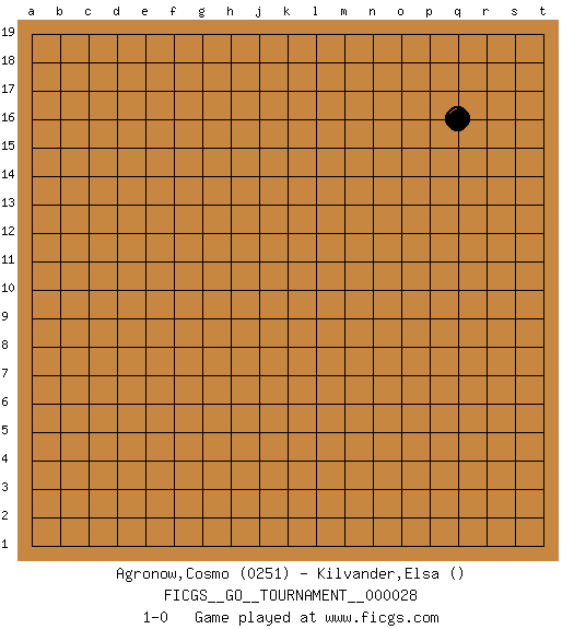 Last move : 1-0 2018 December 28 3:38:36 [Event "FICGS__GO__TOURNAMENT__000028"] [Site "FICGS"] [Date "2018.11.27"] [Round "1"] [Black "Agronow,Cosmo"] [White "Kilvander,Elsa"] [Result "1-0"] [Rating 1 "0251"] 1.q16 1-0 This go game has been lost on time (started : 2018.11.27 14:20:19) Here are the names of the openings (joseki) played in the four corners : Player Black won this Go (weiqi, baduk) game. Follow this game move after move (download)To reduce an opponent's large prospective territory, strike at the shoulder. (Anonymous) If only people were all showed a certain minimum level of niceness; if only people didn't retract verbal draw offers (without draw box ticked) on ficgs; if only people didn't kill; if only people didn't run concentration / extermination camps, if only people didn't drop nuclear bombs on Hiroshima and Nagasaki, and so on - it would be a much more beautiful world. But sadly, things are not so... (Normajean Yates)