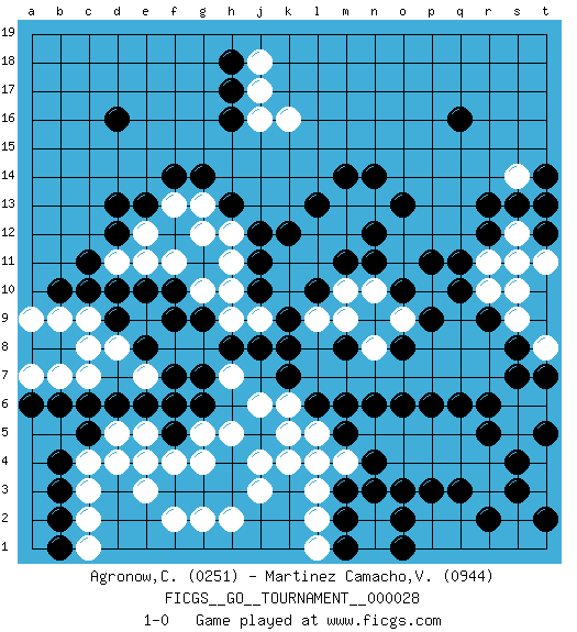 Last move : 1-0 2019 April 11 14:24:38 [Event "FICGS__GO__TOURNAMENT__000028"] [Site "FICGS"] [Date "2018.11.27"] [Round "1"] [Black "Agronow,Cosmo"] [White "Martinez Camacho,Victor Hugo"] [Result "1-0"] [Rating 1 "0251"] [Rating 2 "0944"] 1.q16 d4 2.d16 p4 3.q6 m4 4.n6 o5 5.o6 n5 6.f5 f4 7.h4 g5 8.j8 h5 9.g7 e5 10.f6 j4 11.m5 l5 12.m6 l4 13.d6 k4 14.d10 g4 15.h3 e4 16.e6 d5 17.c5 q5 18.p6 p5 19.r5 r4 20.j5 j6 21.k7 k5 22.q10 s5 23.r6 s6 24.s7 h7 25.h8 k6 26.l6 s10 27.r12 s12 28.s13 s11 29.r13 r11 30.q11 t13 31.t14 r10 32.r9 s9 33.s8 t8 34.t7 k10 35.s4 t4 36.s3 t6 37.t5 r3 38.r2 j3 39.q3 q4 40.n4 n3 41.p3 o4 42.o3 n2 43.n4 h2 44.g3 g2 45.f3 e3 46.o2 n1 47.o1 f2 48.g6 c4 49.b4 c3 50.b3 s14 51.t12 t11 52.t13 c2 53.b2 c1 54.b1 h10 55.j10 j9 56.j11 h9 57.k9 k11 58.k12 l11 59.m11 l12 60.l13 m12 61.n12 m13 62.m14 n13 63.o13 h11 64.j12 m10 65.n11 l9 66.k8 g8 67.n14 m9 68.l10 h12 69.h13 g12 70.e13 g13 71.g14 f8 72.g9 g10 73.f9 f11 74.e10 f13 75.f14 e12 76.d12 e11 77.f10 d11 78.c11 n10 79.o10 o9 80.p9 n8 81.o8 p10 82.p11 k16 83.m2 l2 84.m3 l3 85.m1 l1 86.n3 e9 87.d9 d8 88.e8 c8 89.m8 c9 90.c10 e7 91.f7 c7 92.c6 b7 93.d13 b9 94.b10 a9 95.b6 a7 96.a6 j16 97.h16 j17 98.h17 t3 99.t2 j18 100.h18 1-0 Here are the names of the openings (joseki) played in the four corners : Corner q4 : p4 q6 Takamoku (Gomok, Gaomu`) 5-4 Point. The takamoku (high) point (5-4). With its emphasis on influence, the 5-4 point complements the 4-4 (hoshi) point in creating an influence-oriented fuseki. Corner d4 : d4 f5 Hoshi (Hwajeom, Seongjeom, Xingwei`) 4-4 Point. The star or hoshi (4-4) point, emphasizing influence at the potential expense of territory. Player Black won this Go (weiqi, baduk) game. Follow this game move after move (download)Keep sente in the opening. A premature attack loses sente. (Anonymous) Art is not a thing, it is a way. (Elbert Hubbard)