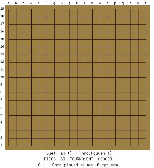 Last move : 0-1 2018 December 27 15:31:30 [Event "FICGS__GO__TOURNAMENT__000028"] [Site "FICGS"] [Date "2018.11.27"] [Round "1"] [Black "Tuyet,Tan"] [White "Thao,Nguyen"] [Result "0-1"] 0-1 This go game has been lost on time (started : 2018.11.27 14:20:19) Here are the names of the openings (joseki) played in the four corners : Player White won this Go (weiqi, baduk) game. Follow this game move after move (download)There are players who don't accept exchange: they play many moves that perpetuate a previous state of the game. (Pierre Audouard) Gambling : The sure way of getting nothing from something. (Wilson Mizner)