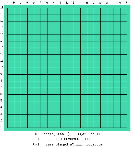 Last move : 0-1 2018 December 27 15:31:30 [Event "FICGS__GO__TOURNAMENT__000028"] [Site "FICGS"] [Date "2018.11.27"] [Round "1"] [Black "Kilvander,Elsa"] [White "Tuyet,Tan"] [Result "0-1"] 0-1 This go game has been lost on time (started : 2018.11.27 14:20:19) Here are the names of the openings (joseki) played in the four corners : Player White won this Go (weiqi, baduk) game. Follow this game move after move (download)Capture what you cut off. (Anonymous) Logic : The art of thinking and reasoning in strict accordance with the limitations and incapacities of the human misunderstanding. (Ambrose Bierce)