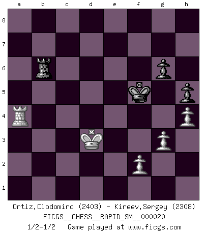 Last move : 1/2-1/2 2018 December 16 17:25:35 [Event "FICGS__CHESS__RAPID_SM__000020"] [Site "FICGS"] [Date "2018.11.27"] [Round "1"] [White "Ortiz,Clodomiro"] [Black "Kireev,Sergey"] [Result "1/2-1/2"] [WhiteElo "2403"] [BlackElo "2308"] 1.d4 d5 2.Nf3 Nf6 3.c4 c6 4.g3 dxc4 5.Bg2 e6 6.Ne5 c5 7.Na3 cxd4 8.Naxc4 Be7 9.O-O O-O 10.Qd3 Bc5 11.Bd2 Qe7 12.a3 Nbd7 13.Nxd7 Nxd7 14.b4 Bb6 15.Rfc1 e5 16.a4 Bc7 17.a5 Nf6 18.a6 e4 19.axb7 Bxb7 20.Qxd4 Qe6 21.b5 Rfd8 22.Qb2 Bd5 23.Ra6 Qe8 24.Bg5 Bxc4 25.Rxc4 Rd1+ 26.Bf1 Qd7 27.Ra1 Rxa1 28.Qxa1 Qxb5 29.Qc1 Ne8 30.Bg2 Bd8 31.Bxd8 Rxd8 32.Rxe4 Rc8 33.Qa1 Qc5 34.Qa6 g6 35.Bf3 Nd6 36.Re3 Re8 37.Ra3 Nb5 38.Ra5 Qc1+ 39.Kg2 Nd4 40.Qxa7 Nxf3 41.exf3 Re1 42.f4 Rg1+ 43.Kh3 Qf1+ 44.Kh4 Qg2 45.Kg4 Re1 46.Qa8+ Qxa8 47.Rxa8+ Kg7 48.Kf3 h5 49.Ra2 Kf6 50.Rb2 Ra1 51.Rb5 Ra2 52.h4 Ra3+ 53.Kg2 Ra4 54.Rg5 Ra1 55.f5 Rb1 56.fxg6 fxg6 57.Rc5 Rb2 58.Kf3 Rb3+ 59.Ke4 Rb4+ 60.Kd3 Rb6 61.Rd5 Ke6 62.Ra5 Kf6 63.Ra4 Kf5 1/2-1/2 Queen's pawn game Kingside Castling by player White (move 9) Kingside Castling by player Black (move 9) 10 pieces endgame at move 56 : White KRPPPP , Black KRPP WHITE : King + 1 Rook 4 Pawns BLACK : King + 1 Rook 2 Pawns 9 pieces endgame at move 56 : White KRPPP , Black KRPP WHITE : King + 1 Rook 3 Pawns BLACK : King + 1 Rook 2 Pawns This chess game ended in a draw. Follow this game move after move (download)Let the perfectionist play postal. (Yasser Seirawan) Wenn Capablanka heute auf der Schachbühne erscheinen würde, hätte er ein halbes Jahr gebraucht um sich die Schachtheorie anzueignen. Und dann hätte er alles und jeden besiegt. (Mikhail Moiseyevich Botvinik) El jugador táctico debe saber que hacer cuando algo se debe de hacer. El estratégico debe saber que hacer cuando nada se debe de hacer. (Savielly Tartakover) Une platitude souvent récitée à propos des Echecs est qu'une des choses les plus difficiles à réaliser est de gagner une position gagnante. Cela ne manque pas de sens mais, pour ma part, j'ai toujours trouvé plus difficile de gagner une position perdante. (Tim Krabbe) Is not life a hundred times too short to bore ourselves ? (Friedrich Nietzsche)