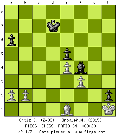 Last move : 1/2-1/2 2019 March 14 23:57:19 [Event "FICGS__CHESS__RAPID_SM__000020"] [Site "FICGS"] [Date "2018.11.27"] [Round "1"] [White "Ortiz,Clodomiro"] [Black "Broniek,Mariusz Maciej"] [Result "1/2-1/2"] [WhiteElo "2403"] [BlackElo "2315"] 1.Nf3 c5 2.e4 d6 3.d4 cxd4 4.Nxd4 Nf6 5.f3 e5 6.Nb3 Be6 7.c4 Nbd7 8.Be3 Rc8 9.Nc3 Bxc4 10.Bxc4 Rxc4 11.Qd3 Rc6 12.g4 Be7 13.O-O-O a6 14.h4 Nc5 15.Nxc5 dxc5 16.Qc2 Qb8 17.Kb1 O-O 18.g5 Nh5 19.Rd7 Bd6 20.Qb3 c4 21.Qxb7 Qxb7 22.Rxb7 f6 23.Nd5 fxg5 24.hxg5 Ng3 25.Nf6+ Rxf6 26.gxf6 Nxh1 27.Rxg7+ Kh8 28.Rg1 Bf8 29.f7 Rg6 30.Rxh1 Rg3 31.Rg1 Rxg1+ 32.Bxg1 Kg7 33.Kc2 Kxf7 34.Kc3 h5 35.Kxc4 Ke6 36.Bf2 Be7 37.Kd3 h4 38.Ke2 h3 39.Kf1 Bg5 40.Kg1 Bf4 41.Kh1 h2 42.Be1 Kd7 1/2-1/2 Comment by player 1 : Clodomiro Ortiz : Nice to see you back from vacation,good luck... Reti Opening Queenside Castling by player White (move 13) Kingside Castling by player Black (move 17) This chess game ended in a draw. Follow this game move after move (download)Every Chess master was once a beginner. (Chernev) Ein Gewinn durch eine ungenaue Kombination, sei sie auch noch so vorzeigbar, erfüllt mich mit Schaudern. (Wilhelm Steinitz) No hay otro maestro que tenga una voluntad terrífica de ganar. Al tablero, el irradía peligro y aún los oponentes mas fuertes tienden a congelarse como liebres cuando olfatean a una pantera. Aún sus debilidades son peligrosas. Con las blancas, su juego de apertura es predecible - te es posible hacer planes en su contra - pero es tan fuerte que tus planes casi nunca funcionan. En el juego medio, su precisión e invención son fabulosas y en finales, tú simplemente no le puedes vencer. (Experto Alemán anónimo) Votre seul travail dans les ouvertures est d'obtenir un milieu de partie jouable. (Lajos Portish) Mac users swear by their computers. PC users swear at their computers. (Author unknown)