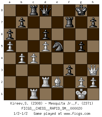 Last move : 1/2-1/2 2019 January 13 14:35:19 [Event "FICGS__CHESS__RAPID_SM__000020"] [Site "FICGS"] [Date "2018.11.27"] [Round "1"] [White "Kireev,Sergey"] [Black "Mesquita Jr.,Fausto Monteiro"] [Result "1/2-1/2"] [WhiteElo "2308"] [BlackElo "2371"] 1.e4 c5 2.Nf3 d6 3.d4 cxd4 4.Nxd4 Nf6 5.Nc3 a6 6.Be3 e5 7.Nb3 Be6 8.Be2 Be7 9.Qd3 O-O 10.O-O Nbd7 11.Nd5 Bxd5 12.exd5 Rc8 13.c4 Ne8 14.a4 f5 15.a5 g6 16.Bh6 Rf7 17.Qe3 Bf6 18.Rfc1 Ng7 19.Nd2 e4 20.Ra2 Be5 21.Bf4 Bxf4 22.Qxf4 Ne5 23.b4 Nh5 24.Qe3 Nf6 25.Qd4 Nh5 26.Qe3 Nf6 27.Rac2 Nfg4 28.Qf4 g5 29.Qg3 f4 30.Qh3 Nxf2 31.Kxf2 e3+ 32.Kg1 exd2 33.Rxd2 f3 1/2-1/2 Sicilian : Najdorf, Byrne (English) attack Kingside Castling by player Black (move 9) Kingside Castling by player White (move 10) This chess game ended in a draw. Follow this game move after move (download)Nonsense was the last thing Fischer was interested in, as far as Chess was concerned. (Elie Agur) Sie führen leise Selbstgespräche, schlürfen lautstark ihre Getränke, schmatzen hörbar beim Essen, blasen ihrem Gegenüber Rauch in die Augen, niesen ihm ins Gesicht, starren ihn unverwandt an, bis er sich unter ihren Blicken windet, rutschen ständig auf ihrem Stuhl hin und her, rülpsen und bohren in der Nase. (Anonymous) La belleza de un movimiento no se refleja solo en su apariencia, sino en el pensamiento detrás de él. (Siegbert Tarrasch) Les Echecs sont et restent toujours un combat, un combat intégral comme la boxe, la lutte ou un autre sport, et où il doit y avoir un vainqueur et un vaincu. (Joseph Emil Diemer) Question: Is 'This statement is paradoxical' a paradoxical statement ? Or is it a meta-paradox ? (Normajean Yates)