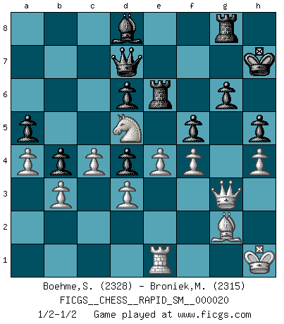 Last move : 1/2-1/2 2019 June 13 11:31:54 [Event "FICGS__CHESS__RAPID_SM__000020"] [Site "FICGS"] [Date "2018.11.27"] [Round "1"] [White "Boehme,Sebastian"] [Black "Broniek,Mariusz Maciej"] [Result "1/2-1/2"] [WhiteElo "2328"] [BlackElo "2315"] 1.Nf3 c5 2.g3 g6 3.Bg2 Bg7 4.O-O Nc6 5.d3 Nf6 6.e4 O-O 7.Nbd2 d6 8.c3 e5 9.a4 h6 10.b3 Bg4 11.Ba3 a6 12.Nc4 Be6 13.Ne3 b5 14.Bb2 b4 15.c4 Qd7 16.Nd5 Rae8 17.Ne1 Qd8 18.Nc2 Bc8 19.Nxf6+ Bxf6 20.Ne3 Bg7 21.Qe2 h5 22.h4 Be6 23.Nd5 Kh7 24.Rae1 a5 25.Kh2 Qc8 26.Qd1 Nd4 27.Bxd4 cxd4 28.Re2 Bg4 29.Qe1 Bxe2 30.Qxe2 Qg4 31.Qb2 Qd7 32.Qe2 f6 33.f4 exf4 34.gxf4 f5 35.Qf2 Qf7 36.Qg3 Re6 37.Kh1 Rfe8 38.Re1 Bh8 39.Bf3 Bg7 40.Kg2 Bh6 41.Kh1 Rf8 42.Rf1 Kh8 43.Kh2 Kh7 44.Kh1 Bg7 45.Rg1 Rfe8 46.Qg2 Kh8 47.Kh2 Bf6 48.Qg3 Bd8 49.Re1 Kh7 50.Qf2 Qd7 51.Qg3 Rg8 52.Bg2 Qe8 53.Kh1 Qd7 1/2-1/2 Reti Opening Kingside Castling by player White (move 4) Kingside Castling by player Black (move 6) This chess game ended in a draw. Follow this game move after move (download)I play correspondence chess because it is both art and science while chess is art only. (A player at FICGS) Ich verstehe mehr vom Schach als irgendein anderer lebender Meister. (José Raúl Capablanca) El Ajedrez lo es todo: arte, ciencia y deporte. (Anatoly Karpov) Même si l'adversaire joue le coup analysé précédemment, recommencez l'analyse en voyant la nouvelle position. Première règle de Blumenfeld Beta. Software undergoes beta testing shortly before it's released. Beta is latin for still doesn't work. (Anonymous)