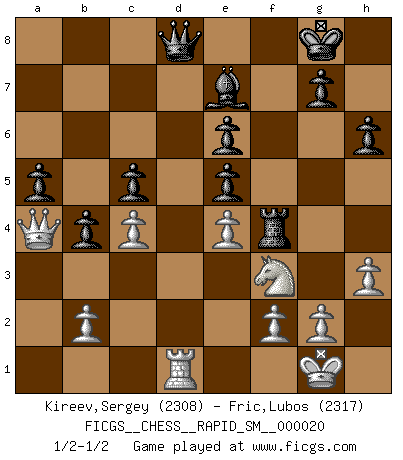 Last move : 1/2-1/2 2019 January 8 20:38:35 [Event "FICGS__CHESS__RAPID_SM__000020"] [Site "FICGS"] [Date "2018.11.27"] [Round "1"] [White "Kireev,Sergey"] [Black "Fric,Lubos"] [Result "1/2-1/2"] [WhiteElo "2308"] [BlackElo "2317"] 1.e4 e5 2.Nf3 Nc6 3.Bb5 a6 4.Ba4 Nf6 5.O-O Be7 6.Re1 b5 7.Bb3 O-O 8.a4 b4 9.a5 d6 10.c3 Rb8 11.d3 Be6 12.Bxe6 fxe6 13.Nbd2 Rb5 14.d4 Nh5 15.c4 Rxa5 16.Rxa5 Nxa5 17.Qa4 c5 18.dxe5 Nf4 19.Nb3 Nxb3 20.Bxf4 Rxf4 21.Qxb3 dxe5 22.Qa4 a5 23.h3 h6 24.Rd1 1/2-1/2 Ruy Lopez : Closed, 7...O-O Kingside Castling by player White (move 5) Kingside Castling by player Black (move 7) This chess game ended in a draw. Follow this game move after move (download)Bobby is the finest Chess player this country ever produced. His memory for the moves, his brilliance in dreaming up combinations, and his fierce determination to win are uncanny. (John Collins) Die Auseinandersetzung mit Karpow war politisch geprägt. Er stand für das kommunistische System, wurde von dessen Repräsentanten gehätschelt. Ich war der Oppositionelle. Jeder Schachweltmeister spiegelt auch die gesellschaftlichen Verhältnisse wider. Kramnik steht für die Börsen-Generation des Neuen Markts, ideologiefrei, zahlenfixiert. (Garry Kasparov) Los Peones son el alma de una partida de Ajedrez. (Francois Andre Danican Philidor) Plusieurs personnes se sont demandées comment Tal faisait pour gagner... En fait, c'est très simple ! Il met ses pièces au centre de l'échiquier et les sacrifie quelque part ! (David Bronstein) There are lots of people who mistake their imagination for their memory. (Josh Bilings)