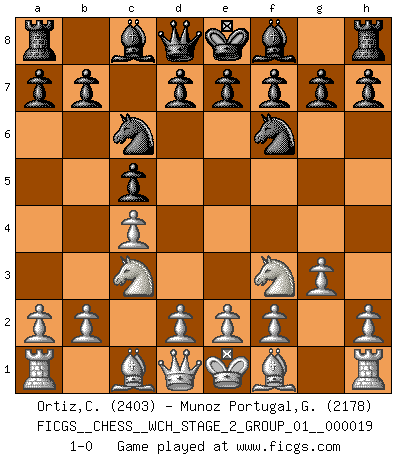 Last move : 1-0 2019 January 1 15:50:54 [Event "FICGS__CHESS__WCH_STAGE_2_GROUP_01__000019"] [Site "FICGS"] [Date "2018.11.27"] [Round "1"] [White "Ortiz,Clodomiro"] [Black "Munoz Portugal,Guillermo"] [Result "1-0"] [WhiteElo "2403"] [BlackElo "2178"] 1.Nf3 Nf6 2.c4 c5 3.Nc3 Nc6 4.g3 1-0 This chess game has been lost on time (started : 2018.11.27 17:23:34) Reti Opening Player White won this chess game. Follow this game move after move (download)Fischer Chess play was always razor-sharp, rational and brilliant. One of the best ever. (Dave Regis) In der Schule lernt man nichts. Es ist nur Zeitverschwendung. (Robert James Fischer) Nos gusta pensar. (Gary Kasparov) Tous ces prétendus hommes politiques sont les pions, les Cavaliers, les Tours ou les Fous d'une partie d'échecs qui se jouera tant qu'un hasard ne renversera pas l'échiquier. (Honoré de Balzac) Big Chess is a place for big hallucinations. (Thibault de Vassal)