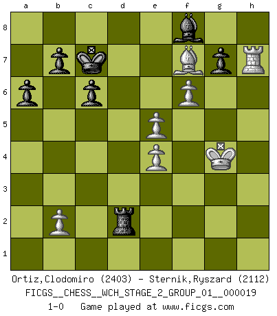 Last move : 1-0 2019 February 6 21:41:12 [Event "FICGS__CHESS__WCH_STAGE_2_GROUP_01__000019"] [Site "FICGS"] [Date "2018.11.27"] [Round "1"] [White "Ortiz,Clodomiro"] [Black "Sternik,Ryszard"] [Result "1-0"] [WhiteElo "2403"] [BlackElo "2112"] 1.d4 Nf6 2.c4 e6 3.g3 d5 4.Nf3 dxc4 5.Bg2 a6 6.O-O Nc6 7.e3 Bd7 8.Qe2 Bd6 9.Qxc4 O-O 10.Nbd2 e5 11.dxe5 Nxe5 12.Nxe5 Bxe5 13.Qc2 Bb5 14.Nc4 Bxc4 15.Qxc4 c6 16.Qc2 Qe7 17.Bd2 Rad8 18.Rfd1 Rfe8 19.a4 h5 20.Ba5 Rxd1+ 21.Rxd1 h4 22.Qb3 hxg3 23.hxg3 Rb8 24.Be1 Qc7 25.Qb4 Qc8 26.Qe7 Qe6 27.Qxe6 fxe6 28.f4 Bc7 29.a5 Kf7 30.Rd3 Rd8 31.Rb3 Rb8 32.Bf3 e5 33.Kf2 Ke6 34.Bg2 Bd6 35.Kf3 Kd7 36.e4 Kc7 37.Bf2 Rh8 38.Rd3 Be7 39.fxe5 Nd7 40.Bd4 Nc5 41.Rd1 Ne6 42.Bb6+ Kc8 43.Bf1 Rh5 44.Be3 Bb4 45.Bf4 Rh1 46.Kg2 Rh8 47.Bc4 Re8 48.Kf3 Bxa5 49.Kg4 Nxf4 50.gxf4 Kc7 51.Bf7 Rd8 52.Rh1 Bb4 53.Rh7 Bf8 54.f5 Rd2 55.f6 1-0 Catalan Opening Kingside Castling by player White (move 6) Kingside Castling by player Black (move 9) Player White won this chess game. Follow this game move after move (download)What is the object of playing a gambit opening?... To acquire a reputation of being a dashing player at the cost of losing a game. (Siegbert Tarrasch) Die Arbeit ist etwas Unnatürliches. Die Faulheit allein ist göttlich. (Anatole France) El Ajedrez es un invernadero donde los frutos del carácter pueden madurar mas completamente que en la vida. (Edward Morgan Foster) Dieu déplace le joueur, et celui-ci la pièce. Quel Dieu derrière Dieu commence donc la trame ? Arturo Perez-Reverte (prix de littérature policière 1993). The best weapon against an enemy is another enemy. (Friedrich Nietzsche)