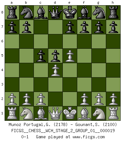 Last move : 0-1 2018 December 31 3:43:16 [Event "FICGS__CHESS__WCH_STAGE_2_GROUP_01__000019"] [Site "FICGS"] [Date "2018.11.27"] [Round "1"] [White "Munoz Portugal,Guillermo"] [Black "Gounant,Stanislas"] [Result "0-1"] [WhiteElo "2178"] [BlackElo "2100"] 1.e4 c6 2.d4 d5 3.e5 c5 0-1 This chess game has been lost on time (started : 2018.11.27 17:23:34) Caro-Kann : Advance variation Player Black won this chess game. Follow this game move after move (download)Botvinnik tried to take the mystery out of Chess, always relating it to situations in ordinary life. He used to call Chess a typical inexact problem similar to those which people are always having to solve in everyday life. (Garry Kasparov) Deine Wertungszahl - vorausgesetzt einige Jahre schachliche Anstrengung - entspricht etwa dem zehnfachen Deines IQ plus 1000. (Jonathan Levitt) Todo lo que importa ante el tablero de Ajedrez son buenas jugadas. (Bobby Fischer) Pour moi, les échecs ne sont pas un jeu mais un art. (Alexandre Alekhine) The problem with manipulation is that people can turn on you. (Horatio Caine, C.S.I. Miami)