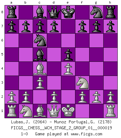 Last move : 1-0 2019 January 1 15:50:54 [Event "FICGS__CHESS__WCH_STAGE_2_GROUP_01__000019"] [Site "FICGS"] [Date "2018.11.27"] [Round "1"] [White "Lubas,Jozef"] [Black "Munoz Portugal,Guillermo"] [Result "1-0"] [WhiteElo "2064"] [BlackElo "2178"] 1.e4 e5 2.Nf3 Nc6 3.Bc4 Bc5 4.c3 1-0 This chess game has been lost on time (started : 2018.11.27 17:23:34) Giuoco Piano Player White won this chess game. Follow this game move after move (download)Chess is above all, a fight ! (Emanuel Lasker) Man gibt nur Pakete auf. (Paul Keres) Una buena ofensiva y una buena defensa, comienzan ambas con un buen desarrollo. (Bruce A. Moon) Les Echecs, c'est l'art de la guerre sans les charniers, c'est la résurrection des morts tombés au champ d'honneur, l'espoir perpétuel, la suprématie de l'intelligence sur la force, la culture de l'esprit. (F. Szpiner) The large trees attract high winds. (Chinese proverb)
