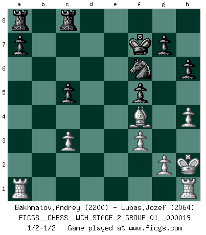Last move : 1/2-1/2 2018 December 25 10:34:5 [Event "FICGS__CHESS__WCH_STAGE_2_GROUP_01__000019"] [Site "FICGS"] [Date "2018.11.27"] [Round "1"] [White "Bakhmatov,Andrey"] [Black "Lubas,Jozef"] [Result "1/2-1/2"] [WhiteElo "2200"] [BlackElo "2064"] 1.d4 Nf6 2.c4 e6 3.Nc3 Bb4 4.f3 d5 5.a3 Bxc3+ 6.bxc3 c5 7.cxd5 Nxd5 8.dxc5 Qa5 9.e4 Nf6 10.Be3 O-O 11.Qb3 Nfd7 12.a4 Qc7 13.Qa3 b6 14.a5 bxc5 15.a6 h6 16.Kf2 f5 17.exf5 Ne5 18.Qa5 Qf7 19.Ne2 Nd3+ 20.Kg1 Bxa6 21.h4 exf5 22.Nf4 Nxf4 23.Bxa6 Nxa6 24.Bxf4 Nb8 25.Kh2 Nd7 26.Qc7 Rfc8 27.Qb7 Nf6 28.Qxf7+ Kxf7 1/2-1/2 Nimzo-Indian : Kmoch variation Kingside Castling by player Black (move 10) This chess game ended in a draw. Follow this game move after move (download)Chess is a more highly symbolic game, but the aggressions are therefore even more frankly represented in the play. It probably began as a war game; that is, the representation of a miniature battle between the forces of two kingdoms. (Karl Meninger) Bis zum Jahr 1971 verlief in meiner Schachkariere alles glatt. Dieses dramatische Match [Fischer-Taimanov 6:0] machte mein Leben zur Hölle. (Mark Taimanov) Solo los afeminados hacen el Enroque. (Rob Sillars) On croit qu'il y a plus de mauvais joueurs que de bons joueurs, c'est faux : Il y a autant de joueurs qui gagnent que de joueurs qui perdent. (Philippe Geluck) The good fighters of old first put themselves beyond the possibility of defeat, and then waited for an opportunity of defeating the enemy. (Sun Tzu)
