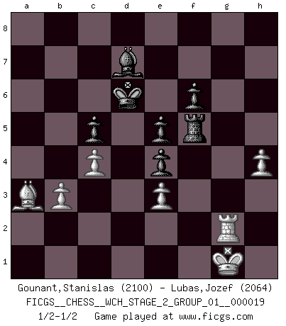 Last move : 1/2-1/2 2018 December 16 21:18:1 [Event "FICGS__CHESS__WCH_STAGE_2_GROUP_01__000019"] [Site "FICGS"] [Date "2018.11.27"] [Round "1"] [White "Gounant,Stanislas"] [Black "Lubas,Jozef"] [Result "1/2-1/2"] [WhiteElo "2100"] [BlackElo "2064"] 1.d4 Nf6 2.Nf3 d5 3.e3 e6 4.Bd3 c5 5.b3 Nc6 6.O-O b6 7.Bb2 Bb7 8.Nbd2 Be7 9.Ne5 O-O 10.a3 Nxe5 11.dxe5 Ne4 12.Bxe4 dxe4 13.Qe2 g6 14.Nc4 Qc7 15.a4 h5 16.g4 hxg4 17.Qxg4 Kg7 18.Nd6 Rh8 19.f4 Rh4 20.Qg2 Rh5 21.a5 Kg8 22.axb6 axb6 23.Rfd1 Rd8 24.c4 Bc6 25.Bc3 Bxd6 26.exd6 Rxd6 27.Be5 Rxd1+ 28.Rxd1 Qe7 29.Qd2 f6 30.Bb2 Kf7 31.Qd6 Qxd6 32.Rxd6 Be8 33.Rxb6 Bd7 34.Rd6 Ke7 35.Rd2 g5 36.fxg5 Rxg5+ 37.Rg2 Rf5 38.h4 e5 39.Ba3 Kd6 1/2-1/2 Queen's pawn game Kingside Castling by player White (move 6) Kingside Castling by player Black (move 9) This chess game ended in a draw. Follow this game move after move (download)All that matters on the Chessboard is good moves. (Bobby Fischer) Ich tröste mich mit dem Vergnügen, daß Schachfans, Zuschauer und Leser glücklich sind, wenn ein Großmeister etwas riskiert, statt nur Klötzchen zu schieben. (Mikhail Nekhemyevich Tal) En partidas rápidas, el Caballo es mas poderoso que el Alfil. (Vlastimil Hort) Il n'y a pas eu de défaite parce que je ne crois pas que cet ordinateur ait jamais existé. IBM a triché en refusant d'imprimer les modes de recherche de la machine. C'est évident, pendant le match, des coups décisifs ont été joués par des êtres humains. Aujourd'hui, les meilleurs spécialistes en informatique ne peuvent toujours pas expliquer comment Deep-Blue a pu jouer contre la logique des ordinateurs. IBM a gagné une guerre de communication, mais ils sont incapables de prouver que l'ordinateur a gagné tout seul. (Garry Kasparov) The Movers & Shakers of this world are those who play chess in the mornings and go to the disco in the evenings. (Dinesh De Silva)