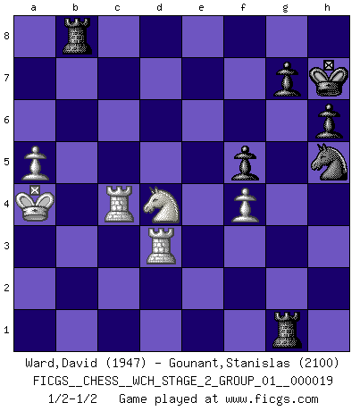 Last move : 1/2-1/2 2019 February 19 1:44:20 [Event "FICGS__CHESS__WCH_STAGE_2_GROUP_01__000019"] [Site "FICGS"] [Date "2018.11.27"] [Round "1"] [White "Ward,David"] [Black "Gounant,Stanislas"] [Result "1/2-1/2"] [WhiteElo "1947"] [BlackElo "2100"] 1.e4 c6 2.d4 d5 3.Nd2 dxe4 4.Nxe4 Bf5 5.Ng3 Bg6 6.h4 h6 7.Nf3 Nd7 8.h5 Bh7 9.Bd3 Bxd3 10.Qxd3 e6 11.Bf4 Qa5+ 12.Bd2 Bb4 13.c3 Be7 14.c4 Qc7 15.O-O-O Ngf6 16.Rhe1 b5 17.cxb5 Rb8 18.bxc6 Qxc6+ 19.Kb1 Qb6 20.b3 O-O 21.Nf5 Bb4 22.Bxb4 Qxb4 23.Ne3 a5 24.Ne5 Qb7 25.Rc1 a4 26.Nc6 Ra8 27.d5 Nb8 28.Ne5 Nbd7 29.Nc6 Nb8 30.Ne5 Nxd5 31.Nxd5 exd5 32.Re3 Ra6 33.Qd4 axb3 34.Rxb3 Qe7 35.Rg3 Qf6 36.Rc7 Re6 37.f4 Na6 38.Rc1 Rfe8 39.a3 Qf5+ 40.Ka1 f6 41.Qd3 Qe4 42.Ng6 f5 43.Qd2 d4 44.Ne5 Rb8 45.Re1 Qd5 46.Qa2 Qxa2+ 47.Kxa2 Nc5 48.Rb1 Rd8 49.Rc1 Ne4 50.Rd3 Nf6 51.a4 Nxh5 52.g3 Kh7 53.Rc4 Rb6 54.Ka3 Rb1 55.Nc6 Rc8 56.a5 Rg1 57.Kb4 Nxg3 58.Nxd4 Rb8+ 59.Ka4 Nh5 1/2-1/2 Caro-Kann : 3.Nd2 Queenside Castling by player White (move 15) Kingside Castling by player Black (move 20) This chess game ended in a draw. Follow this game move after move (download)My style is somewhere between that of Tal and Petrosian. (Reshevsky) Ich hatte Zahnschmerzen im ersten Spiel. In der zweiten Partie tat mir der Kopf weh. In der dritten war es eine Rheuma-Attacke und während der vierten fühlte ich mich nicht gut. Und in der fünften? Nun, man muss doch nicht jedes Spiel gewinnen, oder? (Savielly Grigorievitsch Tartakower) El Ajedrez es un cuento de Hadas de las 1001 metidas de pata. (Savielly Tartakower) Si je n'étais pas joueur d'échecs, je serais le meilleur dans quelque chose d'autre. (Anatoli Karpov) All art requires courage. (Anne Tucker)