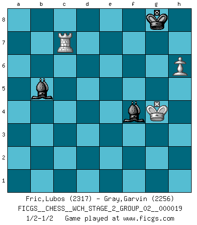 Last move : 1/2-1/2 2019 May 15 10:4:44 [Event "FICGS__CHESS__WCH_STAGE_2_GROUP_02__000019"] [Site "FICGS"] [Date "2018.11.27"] [Round "1"] [White "Fric,Lubos"] [Black "Gray,Garvin"] [Result "1/2-1/2"] [WhiteElo "2317"] [BlackElo "2256"] 1.e4 e5 2.Nf3 Nf6 3.Nxe5 d6 4.Nf3 Nxe4 5.Nc3 Nxc3 6.dxc3 Be7 7.Be3 O-O 8.Qd2 Nd7 9.O-O-O c6 10.Kb1 d5 11.h4 a5 12.h5 Re8 13.c4 Nf6 14.h6 g6 15.cxd5 Nxd5 16.Bc4 Bf5 17.a3 Bf8 18.Bxd5 cxd5 19.Nd4 Bd7 20.Ne2 Rc8 21.Nc3 Bf5 22.Qc1 Rc4 23.Rxd5 Qc8 24.Qd2 Qc6 25.Rxa5 b5 26.Ra7 b4 27.Qd5 Bxc2+ 28.Ka1 Qe6 29.Qxe6 Rxe6 30.axb4 Rxb4 31.Rc1 Bb3 32.Ra8 Rc6 33.Kb1 Rbc4 34.Rb8 Rb4 35.Rd8 Be6 36.Kc2 Rd6 37.Rxd6 Bxd6 38.Ra1 Rb8 39.Ra7 Be5 40.g3 Bf5+ 41.Kc1 Rc8 42.Kd2 Rd8+ 43.Ke2 Re8 44.Kd2 Rd8+ 45.Ke1 Re8 46.Kf1 Bd3+ 47.Kg1 f5 48.Kh2 Bc4 49.Na4 Bd5 50.Nb6 Bf3 51.b4 g5 52.Nc4 Bc3 53.Rd7 Bxb4 54.Rg7+ Kf8 55.Rxh7 Bc3 56.Nd2 Kg8 57.Rd7 Bc6 58.Rc7 f4 59.gxf4 gxf4 60.Bxf4 Rf8 61.Kg3 Rxf4 62.Kxf4 Bxd2+ 63.Kg4 Bb5 64.f4 Bxf4 1/2-1/2 Petrov : Nimzovich attack Kingside Castling by player Black (move 7) Queenside Castling by player White (move 9) 10 pieces endgame at move 60 : White KRBNPP , Black KRBB WHITE : King + 1 Rook 1 Bishop 1 Knight 2 Pawns BLACK : King + 1 Rook 2 Bishops 9 pieces endgame at move 61 : White KRNPP , Black KRBB WHITE : King + 1 Rook 1 Knight 2 Pawns BLACK : King + 1 Rook 2 Bishops 8 pieces endgame at move 62 : White KRNPP , Black KBB WHITE : King + 1 Rook 1 Knight 2 Pawns BLACK : King + 2 Bishops 7 pieces endgame at move 62 : White KRPP , Black KBB WHITE : King + 1 Rook 2 Pawns BLACK : King + 2 Bishops 6 pieces endgame at move 64 : White KRP , Black KBB WHITE : King + 1 Rook 1 Pawn BLACK : King + 2 Bishops This chess game ended in a draw. Follow this game move after move (download)Chess is imagination. (David Bronstein) Wenn es im Universum noch irgendwo intelligente Lebewesen gibt, dann kennen sie Go. (Emanuel Lasker) El muchacho (en ese entonces un niño de 12 años llamado Anatoly Karpov) no tiene ni idea de lo que es el Ajedrez y no hay futuro en absoluto para el en esta profesión. (Mikhail Botvinnik) Une platitude souvent récitée à propos des Echecs est qu'une des choses les plus difficiles à réaliser est de gagner une position gagnante. Cela ne manque pas de sens mais, pour ma part, j'ai toujours trouvé plus difficile de gagner une position perdante. (Tim Krabbe) The only thing that overcomes hard luck is hard work. (Harry Golden)