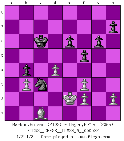 Last move : 1/2-1/2 2007 June 26 22:16:25 [Event "FICGS__CHESS__CLASS_A__000022"] [Site "FICGS"] [Date "2007.05.24"] [Round "1"] [White "Markus,Roland"] [Black "Unger,Peter"] [Result "1/2-1/2"] [WhiteElo "2103"] [BlackElo "2065"] 1.e4 c5 2.c3 Nf6 3.e5 Nd5 4.Nf3 Nc6 5.Bc4 Nb6 6.Bb3 d5 7.exd6 Qxd6 8.O-O c4 9.Bc2 Bg4 10.Re1 Qf6 11.b3 Bxf3 12.Qxf3 Qxf3 13.gxf3 e6 14.Na3 Bxa3 15.Bxa3 O-O-O 16.Bc1 cxb3 17.axb3 Nd5 18.Bb2 Kc7 19.d4 a5 20.Rad1 b5 21.Be4 b4 22.cxb4 axb4 23.Rc1 Rd6 24.Ra1 Kb7 25.Rec1 f5 26.Bd3 Ra8 27.Rxa8 Kxa8 28.Bb5 Kb7 29.Kf1 g6 30.Ke2 Kb6 31.Rxc6+ Rxc6 32.Bxc6 Kxc6 33.Bc1 Nc3+ 1/2-1/2 Sicilian : Alapin's variation (2.c3) Kingside Castling by player White (move 8) Queenside Castling by player Black (move 15) This chess game ended in a draw. Follow this game move after move (download)As one by one I mowed them down, my superiority soon became apparent. (Jose Capablanca) Ein Buch ist ein Spiegel; wenn ein Affe hineinsieht, so kann kein Apostel heraus gucken. (Georg Christoph Lichtenberg) Hay jugadores fuertes y personas amables y yo soy un jugador fuerte. (Bobby Fischer) Vous savez, camarade Pachman, je n'éprouve pas de plaisir à être ministre, je jouerais plutôt aux échecs comme vous, ou alors ferais une révolution au Venezuela. (Che Guevara à Ludek Pachman, 'Checkmate in Prague', 1975) Ah, the Socrating method. The best way we have of teaching everything-apart from juggling chainsaws. (Gregory House, House M.D.)