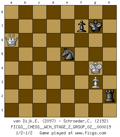 Last move : 1/2-1/2 2019 March 14 10:30:35 [Event "FICGS__CHESS__WCH_STAGE_2_GROUP_02__000019"] [Site "FICGS"] [Date "2018.11.27"] [Round "1"] [White "van Dijk,Erik L."] [Black "Schroeder,Christoph"] [Result "1/2-1/2"] [WhiteElo "2097"] [BlackElo "2192"] 1.e4 e5 2.Nf3 Nc6 3.Bb5 a6 4.Ba4 Nf6 5.O-O Nxe4 6.d4 b5 7.Bb3 d5 8.dxe5 Be6 9.Nbd2 Nc5 10.c3 d4 11.Bxe6 Nxe6 12.cxd4 Ncxd4 13.a4 Bb4 14.axb5 Nxb5 15.Nc4 O-O 16.Be3 Qe7 17.Qc2 Rfd8 18.Qe4 Qd7 19.g3 Bc5 20.Rfd1 Qxd1+ 21.Rxd1 Rxd1+ 22.Kg2 Rb8 23.Ng5 Nxg5 24.Bxg5 Rd4 25.Qe2 Rd5 26.Qf3 c6 27.Qb3 Ra8 28.Be3 Re8 29.Bxc5 Rxc5 30.Qb4 Rd5 31.f4 Rf8 32.Qe7 Nd4 33.Qa7 g6 34.Nb6 Rb5 35.Nd7 Rxb2+ 36.Kh3 Ne6 37.Nxf8 Kxf8 38.Qa8+ Kg7 39.Qxc6 h5 40.Qxa6 g5 41.fxg5 Nxg5+ 42.Kh4 Nf3+ 43.Kxh5 Rxh2+ 44.Kg4 Nxe5+ 1/2-1/2 Ruy Lopez : Open, 7.Bb3 Kingside Castling by player White (move 5) Kingside Castling by player Black (move 15) 10 pieces endgame at move 41 : White KQPPP , Black KRNPP WHITE : King + 1 Queen 3 Pawns BLACK : King + 1 Rook 1 Knight 2 Pawns 9 pieces endgame at move 43 : White KQPPP , Black KRNP WHITE : King + 1 Queen 3 Pawns BLACK : King + 1 Rook 1 Knight 1 Pawn 8 pieces endgame at move 43 : White KQPP , Black KRNP WHITE : King + 1 Queen 2 Pawns BLACK : King + 1 Rook 1 Knight 1 Pawn 7 pieces endgame at move 44 : White KQP , Black KRNP WHITE : King + 1 Queen 1 Pawn BLACK : King + 1 Rook 1 Knight 1 Pawn This chess game ended in a draw. Follow this game move after move (download)No price is too great for the scalp of the enemy King. (Koblentz) Zum Sieg gelangt man nicht, wenn man gut, sondern nur wenn man besser spielt (Savielly Grigorievitsch Tartakower) Si pudieramos observar el interior de la cabeza de un jugador de Ajedrez, encontraríamos ahí un mundo lleno de sentimientos, imágenes, ideas, emoción y pasión. (Alfred Binet) Je menace de comprendre la position. (Anonyme) Thus, what is of supreme importance in war is to attack the enemy's strategy. (Sun Tzu)