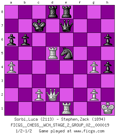 Last move : 1/2-1/2 2019 February 5 14:38:42 [Event "FICGS__CHESS__WCH_STAGE_2_GROUP_02__000019"] [Site "FICGS"] [Date "2018.11.27"] [Round "1"] [White "Sorbi,Luca"] [Black "Stephen,Zack"] [Result "1/2-1/2"] [WhiteElo "2113"] [BlackElo "1894"] 1.e4 c5 2.Nf3 d6 3.d4 cxd4 4.Nxd4 Nf6 5.Nc3 a6 6.Bg5 e6 7.f4 Qb6 8.Qd2 Qxb2 9.Rb1 Qa3 10.e5 h6 11.Bh4 dxe5 12.fxe5 g5 13.exf6 gxh4 14.Be2 Nd7 15.O-O Qa5 16.Kh1 Qg5 17.Rf4 e5 18.Nd5 exd4 19.Qxd4 Kd8 20.Ne7 Qe5 21.Qd2 Bxe7 22.fxe7+ Qxe7 23.Bg4 f5 24.Rxf5 Re8 25.Rd5 b6 26.h3 Kc7 27.a4 Ne5 28.Re1 Bxg4 29.hxg4 Rad8 1/2-1/2 Sicilian : Najdorf, 7...Qb6 Kingside Castling by player White (move 15) This chess game ended in a draw. Follow this game move after move (download)Look at Garry Kasparov. After he loses, invariably he wins the next game. He just kills the next guy. That's something that we have to learn to be able to do. (Maurice Ashley) Drei Punkte vor allen anderen ist wie einer, der im weißen Anzug posiert, während der Rest in Müllsäcke gekleidet dasteht. (Viktor Kortschnoi) En el Ajedrez, tal como es jugado por los Maestros, practicamente la suerte es eliminada. (Emanuel Lasker) Il n'y a pas eu de défaite parce que je ne crois pas que cet ordinateur ait jamais existé. IBM a triché en refusant d'imprimer les modes de recherche de la machine. C'est évident, pendant le match, des coups décisifs ont été joués par des êtres humains. Aujourd'hui, les meilleurs spécialistes en informatique ne peuvent toujours pas expliquer comment Deep-Blue a pu jouer contre la logique des ordinateurs. IBM a gagné une guerre de communication, mais ils sont incapables de prouver que l'ordinateur a gagné tout seul. (Garry Kasparov) You cannot beat a roulette table unless you steal money from it. (Albert Einstein)