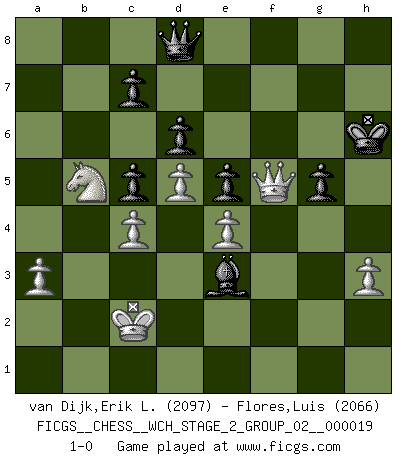 Last move : 1-0 2019 May 1 16:6:46 [Event "FICGS__CHESS__WCH_STAGE_2_GROUP_02__000019"] [Site "FICGS"] [Date "2018.11.27"] [Round "1"] [White "van Dijk,Erik L."] [Black "Flores,Luis"] [Result "1-0"] [WhiteElo "2097"] [BlackElo "2066"] 1.d4 Nf6 2.c4 g6 3.Nc3 Bg7 4.e4 d6 5.f3 O-O 6.Be3 e5 7.d5 Nh5 8.Qd2 f5 9.exf5 gxf5 10.O-O-O a5 11.Bd3 Na6 12.Nge2 Bd7 13.Bb1 Kh8 14.a3 b6 15.Bc2 Nc5 16.Kb1 a4 17.Nb5 Nb3 18.Qb4 Nc5 19.Nec3 f4 20.Bf2 Bf5 21.Bxf5 Rxf5 22.Ne2 Rf7 23.Bxc5 bxc5 24.Qd2 Qf6 25.Nec3 Qf5+ 26.Ne4 Nf6 27.Qc2 Nxe4 28.fxe4 Qc8 29.Rd3 Bh6 30.Rh3 Bg5 31.Rg1 Rg7 32.Rf3 Bh6 33.g3 Qa6 34.R3f1 Rag8 35.Rf3 Rf7 36.Rgf1 Rg6 37.Ka1 Rgf6 38.Qc3 Qb6 39.gxf4 Bxf4 40.Qc2 Qa6 41.R1f2 Rg6 42.Rg3 Rgf6 43.Rg4 Qa8 44.Qd1 Rg6 45.Rxg6 hxg6 46.Qg4 Rg7 47.Rf3 Qd8 48.Rh3+ Rh7 49.Rxh7+ Kxh7 50.Ka2 Kh6 51.h3 g5 52.b3 axb3+ 53.Kxb3 Bd2 54.Kc2 Be3 55.Qf5 1-0 King's Indian : Saemisch, Orthodox, 7.d5 Kingside Castling by player Black (move 5) Queenside Castling by player White (move 10) Player White won this chess game. Follow this game move after move (download)Fischer is under obligation to nobody. (Joseph Platz) Je älter ich werde, um so mehr schätze ich die Bauern. (Paul Keres) Cuando la partida de Ajedrez termina, el Peón y el Rey regresan a la misma caja. (Irish saying) Les ravages du H expliquent la différence de niveau entre Tal et Thal [Abergel]. The difference between perseverance and obstinacy is that one comes from a strong will, and the other from a strong won't. (Henry Ward Beecher)
