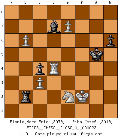 Last move : 1-0 2007 July 10 15:24:52 [Event "FICGS__CHESS__CLASS_A__000022"] [Site "FICGS"] [Date "2007.05.24"] [Round "1"] [White "Plante,Marc-Eric"] [Black "Riha,Josef"] [Result "1-0"] [WhiteElo "2079"] [BlackElo "2019"] 1.e4 e6 2.d4 d5 3.Nc3 Bb4 4.e5 c5 5.a3 Ba5 6.b4 cxd4 7.Nb5 Bc7 8.f4 Bd7 9.Nxc7+ Qxc7 10.Nf3 Ne7 11.Bd3 a6 12.Bb2 Nf5 13.Bxf5 exf5 14.Bxd4 O-O 15.O-O Rc8 16.c3 a5 17.Qd3 Qc4 18.Qxc4 dxc4 19.Bb6 axb4 20.axb4 Rxa1 21.Rxa1 Nc6 22.Bc5 h6 23.h4 Nd8 24.Nd4 Nc6 25.Nc2 Be6 26.h5 Kh7 27.Ne3 g5 28.hxg6+ fxg6 29.Bd6 g5 30.b5 Nd8 31.g4 gxf4 32.Nxf5 Nf7 33.Ra7 Rg8 34.Rxb7 Rxg4+ 35.Kf1 Kg6 36.Nd4 Bd5 37.Rb6 Ng5 38.Be7 Kh5 39.Bxg5 Kxg5 40.e6 Kf6 41.Rd6 Bg2+ 42.Kf2 Rg8 43.Rd7 Be4 44.b6 Rg2+ 45.Kf1 Rb2 46.Rf7+ Kg5 47.e7 Rb1+ 48.Kf2 Rb2+ 49.Ne2 Bc6 50.Rxf4 Bd7 51.Rd4 1-0 French : Winawer, Advance, 5.a3 Kingside Castling by player Black (move 14) Kingside Castling by player White (move 15) Player White won this chess game. Follow this game move after move (download)Openings teach you openings. Endgames teach you chess ! (Stephan Gerzadowicz) Ein Teil des Fehlers ist immer korrekt. (Savielly Grigorievitsch Tartakower) El Ajedrez te enseña a controlarl la excitación inicial que sientes cuando vez algo que parece bueno y te enseña a pensar objetivamente cuando te encuentras en problemas. (Stanley Kubrick) La victoire dans une partie d'Echecs appartient la plupart du temps à celui qui voit un peu plus loin que l'adversaire. (Lasker) Always two there are. No more no less. A master, and an apprentice. (Master Yoda in Star Wars ep.1)