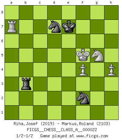 Last move : 1/2-1/2 2007 July 3 14:56:9 [Event "FICGS__CHESS__CLASS_A__000022"] [Site "FICGS"] [Date "2007.05.24"] [Round "1"] [White "Riha,Josef"] [Black "Markus,Roland"] [Result "1/2-1/2"] [WhiteElo "2019"] [BlackElo "2103"] 1.d4 Nf6 2.c4 e6 3.Nf3 b6 4.g3 Ba6 5.b3 Bb4+ 6.Bd2 Be7 7.Bg2 c6 8.Bc3 d5 9.Nbd2 Nbd7 10.O-O O-O 11.Rc1 Rc8 12.Re1 c5 13.Bb2 b5 14.cxd5 Nxd5 15.a3 b4 16.axb4 Nxb4 17.Nc4 Nb6 18.Nce5 Bd6 19.Ba3 cxd4 20.Qxd4 Qe7 21.Red1 Rxc1 22.Rxc1 Bb7 23.Ng5 Bxg2 24.Kxg2 N4d5 25.Bxd6 Qxd6 26.Qd3 g6 27.Ngf3 f6 28.Nxg6 hxg6 29.Qxg6+ Kh8 30.Qh6+ Kg8 31.e4 Ne7 32.e5 Qd3 33.exf6 Qg6 34.Qxg6+ Nxg6 35.Ng5 Rxf6 36.Rc7 Ne5 37.Rxa7 Nd3 38.Ne4 Rf5 39.f4 Nd5 40.h4 Rf8 41.Ra6 Rb8 42.Ng5 Rxb3 43.Nxe6 Ne1+ 44.Kh3 Nd3 45.Kg4 Nf2+ 46.Kf5 Rxg3 47.Ra8+ Kf7 48.Ng5+ Ke7 49.Ke5 Nb6 50.Ra7+ Nd7+ 51.Kf5 Rb3 1/2-1/2 Queen's Indian : Nimzovich variation (exaggerated Fianchetto) Kingside Castling by player White (move 10) Kingside Castling by player Black (move 10) 10 pieces endgame at move 43 : White KRNPPP , Black KRNN WHITE : King + 1 Rook 1 Knight 3 Pawns BLACK : King + 1 Rook 2 Knights 9 pieces endgame at move 46 : White KRNPP , Black KRNN WHITE : King + 1 Rook 1 Knight 2 Pawns BLACK : King + 1 Rook 2 Knights This chess game ended in a draw. Follow this game move after move (download)The hallmark of the artist is simplicity. (Larry Evans) Ein Gewinn durch eine ungenaue Kombination, sei sie auch noch so vorzeigbar, erfüllt mich mit Schaudern. (Wilhelm Steinitz) No solamente yo pronostico su triunfo sobre Botvinnik, sino que me adelanto y digo que probablemente Fischer es el jugador de Ajedrez mas grande que haya existido. (John Collins) Avec des compensations pour le matériel en plus... (Anonyme) Kids, you tried your best and you failed miserably. The lesson is, never try. (Simpsons)