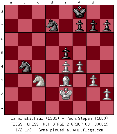Last move : 1/2-1/2 2019 April 18 19:42:9 [Event "FICGS__CHESS__WCH_STAGE_2_GROUP_03__000019"] [Site "FICGS"] [Date "2018.11.27"] [Round "1"] [White "Larwinski,Paul"] [Black "Pech,Stepan"] [Result "1/2-1/2"] [WhiteElo "2285"] [BlackElo "1680"] 1.Nf3 Nf6 2.g3 d5 3.Bg2 c5 4.O-O Nc6 5.d4 e6 6.c4 dxc4 7.dxc5 Qxd1 8.Rxd1 Bxc5 9.Nbd2 c3 10.bxc3 O-O 11.Nb3 Be7 12.c4 Bd7 13.Bb2 Rfd8 14.Nfd4 Rac8 15.Nb5 b6 16.Nd6 Bxd6 17.Rxd6 Be8 18.Rxd8 Nxd8 19.Rc1 Bc6 20.f3 Nd7 21.c5 Bd5 22.cxb6 Rxc1+ 23.Bxc1 axb6 24.e4 Bc4 25.Bf1 Bxf1 26.Kxf1 Nc6 27.f4 b5 28.Ke2 e5 29.Be3 Kf8 30.Nd2 Nb4 31.a3 Nc2 32.Nb1 b4 33.axb4 Nxb4 34.Nc3 1/2-1/2 Reti Opening Kingside Castling by player White (move 4) Kingside Castling by player Black (move 10) This chess game ended in a draw. Follow this game move after move (download)We don't really know how the game was invented, though there are suspicions. As soon as we discover the culprits, we'll let you know. (Bruce Pandolfini) Um dein Spiel zu verbessern musst du zuallererst das Endspiel studieren, denn diese kann unabhängig studiert werden. Die Eröffnung und das Mittelspiel müssen immer in Bezug gesetzt werden zum Endspiel. (José Raúl Capablanca) El Ajedrez es imaginación. (David Bronstein) Karpov est une pièce de musée. (Garry Kasparov) Everything in life is luck. (Donald Trump)