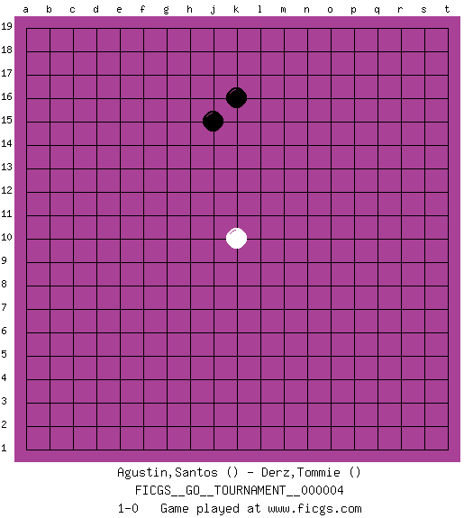 Last move : 1-0 2006 July 11 1:14:56 [Event "FICGS__GO__TOURNAMENT__000004"] [Site "FICGS"] [Date "2006.06.08"] [Round "1"] [Black "Agustin,Santos"] [White "Derz,Tommie"] [Result "1-0"] 1.k16 k10 2.j15 1-0 This go game has been lost on time (started : 2006.06.08 14:53:11) Here are the names of the openings (joseki) played in the four corners : Player Black won this Go (weiqi, baduk) game. Follow this game move after move (download)Go is to western chess what philosophy is to double entry accounting. (from Shibumi, by Trevanian) Don't be discouraged. It's often the last key in the bunch that opens the lock. (Author unknown)