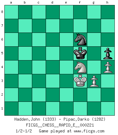 Last move : 1/2-1/2 2019 January 29 10:13:0 [Event "FICGS__CHESS__RAPID_E__000221"] [Site "FICGS"] [Date "2018.11.27"] [Round "1"] [White "Hadden,John"] [Black "Pipac,Darko"] [Result "1/2-1/2"] [WhiteElo "1333"] [BlackElo "1282"] 1.d4 d5 2.c4 dxc4 3.e3 e5 4.Ne2 exd4 5.Qxd4 Qxd4 6.Nxd4 Bb4+ 7.Bd2 Bxd2+ 8.Nxd2 c3 9.bxc3 a6 10.Bd3 Bd7 11.O-O Nf6 12.Bf5 Bxf5 13.Nxf5 g6 14.Nd4 O-O 15.Rab1 b5 16.f4 c5 17.N4b3 c4 18.Nd4 Re8 19.Rfe1 Nbd7 20.g3 Nd5 21.Rbc1 Nxe3 22.N2f3 Nd5 23.Rxe8+ Rxe8 24.Kf2 Re3 25.Nc6 Rxc3 26.Rxc3 Nxc3 27.a3 Kg7 28.Nb4 a5 29.Nc2 Nf6 30.Ke3 Nfd5+ 31.Kd4 f5 32.Kc5 Kf6 33.Nfd4 b4 34.axb4 axb4 35.Nxb4 Nxb4 36.Kxb4 Ne4 37.Kxc4 g5 38.fxg5+ Kxg5 39.Kd3 Nf6 40.Ke2 Ng4 41.Nf3+ Kg6 42.Kf1 h5 43.Kg2 Kf6 44.Kh3 Kg6 45.Kg2 Kf6 46.Nh4 Ke5 47.Ng6+ Kf6 48.Nf4 Kg5 49.h3 Ne3+ 50.Kf3 Nf1 51.h4+ Kh6 52.Ne2 Nd2+ 53.Kf4 Kg6 54.Nd4 Ne4 55.Nxf5 Nf6 56.Nd4 Nd5+ 57.Kf3 Nf6 58.Ne2 Kf5 59.Nf4 1/2-1/2 Queen's gambit accepted Kingside Castling by player White (move 11) Kingside Castling by player Black (move 14) 10 pieces endgame at move 37 : White KNPPP , Black KNPPP WHITE : King + 1 Knight 3 Pawns BLACK : King + 1 Knight 3 Pawns 9 pieces endgame at move 38 : White KNPPP , Black KNPP WHITE : King + 1 Knight 3 Pawns BLACK : King + 1 Knight 2 Pawns 8 pieces endgame at move 38 : White KNPP , Black KNPP WHITE : King + 1 Knight 2 Pawns BLACK : King + 1 Knight 2 Pawns 7 pieces endgame at move 55 : White KNPP , Black KNP WHITE : King + 1 Knight 2 Pawns BLACK : King + 1 Knight 1 Pawn This chess game ended in a draw. Follow this game move after move (download)It's always better to sacrifice your opponent's men. (Savielly Tartakover) Versuche, dich von der Sklaverei der Eröffnungsvarianten zu befreien. Stattdessen soll man gewisse Typenpositionen erlernen, die man eingehend analysiert. (Aaron Nimzowitsch) El Ajedrez se juega con la mente... ¡no con las manos!. (Renaud y Kahn) Si le désir cupide (et stupide) de gagner est une inépuisable source de souffrance, une combinaison brillante sur l'échiquier est une découverte : le coquelicot qui s'épanouit lorsque apparaît la Voie Lactée. (Arrabal) Luck never gives; it only lends. (Swedish proverb)
