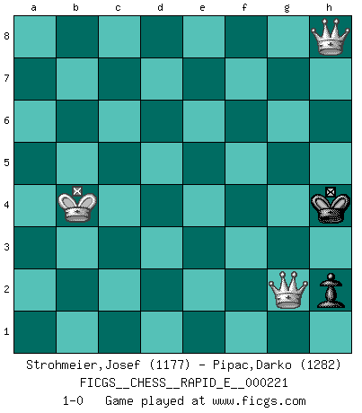 Last move : 1-0 2019 March 3 20:26:8 [Event "FICGS__CHESS__RAPID_E__000221"] [Site "FICGS"] [Date "2018.11.27"] [Round "1"] [White "Strohmeier,Josef"] [Black "Pipac,Darko"] [Result "1-0"] [WhiteElo "1177"] [BlackElo "1282"] 1.e4 e5 2.Nf3 Nc6 3.Bb5 d6 4.d4 Bd7 5.Nc3 exd4 6.Nxd4 Nxd4 7.Bxd7+ Qxd7 8.Qxd4 Nf6 9.O-O b6 10.Bg5 Be7 11.Nd5 Nxd5 12.Qxd5 O-O 13.Bxe7 Qxe7 14.Rfe1 c5 15.Rad1 Rfe8 16.Qxd6 Qxd6 17.Rxd6 Rad8 18.Rxd8 Rxd8 19.Kf1 Rd2 20.Rc1 Rd4 21.f3 g5 22.Ke2 f6 23.Rd1 Rxd1 24.Kxd1 Kf7 25.Kd2 Ke6 26.Kd3 Ke5 27.g3 h5 28.a3 g4 29.Ke3 f5 30.exf5 Kxf5 31.f4 a6 32.c4 b5 33.b3 bxc4 34.bxc4 a5 35.a4 Kf6 36.Ke4 Ke6 37.f5+ Kf6 38.Kd5 Kxf5 39.Kxc5 Ke4 40.Kb5 Kf3 41.c5 Kg2 42.c6 Kxh2 43.c7 Kxg3 44.c8Q Kh3 45.Kxa5 h4 46.Qf5 Kg3 47.Qd3+ Kh2 48.Qe2+ Kh3 49.Qf1+ Kg3 50.Qg1+ Kh3 51.Kb4 g3 52.a5 g2 53.a6 Kg3 54.a7 h3 55.a8Q h2 56.Qg1xg2+ Kh4 57.Qh8+ 1-0 Ruy Lopez : Old Steinitz defense Kingside Castling by player White (move 9) Kingside Castling by player Black (move 12) 10 pieces endgame at move 38 : White KPPPP , Black KPPPP WHITE : King + 4 Pawns BLACK : King + 4 Pawns 9 pieces endgame at move 39 : White KPPPP , Black KPPP WHITE : King + 4 Pawns BLACK : King + 3 Pawns 8 pieces endgame at move 42 : White KPPP , Black KPPP WHITE : King + 3 Pawns BLACK : King + 3 Pawns 7 pieces endgame at move 43 : White KPP , Black KPPP WHITE : King + 2 Pawns BLACK : King + 3 Pawns Promotion Queen by player White (move 44) 6 pieces endgame at move 45 : White KQP , Black KPP WHITE : King + 1 Queen 1 Pawn BLACK : King + 2 Pawns Promotion Queen by player White (move 55) 5 pieces endgame at move 56 : White KQQ , Black KP WHITE : King + 2 Queens BLACK : King + 1 Pawn Player White won this chess game. Follow this game move after move (download)Help your pieces so they can help you. (Paul Morphy) Wenn du auf das Glück wartest, wird das Leben ziemlich langweilig. (Mikhail Nekhemyevich Tal) Juega la Apertura como un libro, el Juego Medio como un mago y los Finales como una máquina. (Spielmann) Demandez au pauvre Cg1 ce qu'il en pense. Eduard Gufeld à propos de la variante Saemisch de l'Est-Indienne. Life is like a ten-speed bicycle: most of us have gears we never use. (Charles M. Schulz)
