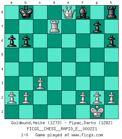 Last move : 1-0 2018 December 24 6:52:43 [Event "FICGS__CHESS__RAPID_E__000221"] [Site "FICGS"] [Date "2018.11.27"] [Round "1"] [White "Goldmund,Heike"] [Black "Pipac,Darko"] [Result "1-0"] [WhiteElo "1273"] [BlackElo "1282"] 1.e4 e5 2.Nf3 Nc6 3.Bc4 h6 4.c3 d6 5.O-O Bg4 6.d3 Nf6 7.Be3 a6 8.Nbd2 Qd7 9.d4 O-O-O 10.Qc2 Bxf3 11.Nxf3 exd4 12.Nxd4 d5 13.exd5 Nxd5 14.Nxc6 Qxc6 15.Qf5+ Qe6 16.Qf3 c6 17.Bb6 Rd7 18.Rfe1 Qf6 19.Re8+ Rd8 20.Rxd8+ Qxd8 21.Bxd8 Kxd8 22.Rd1 Kc7 23.Bxd5 cxd5 24.Qxf7+ Kc6 25.Qxd5+ Kc7 26.Qd7+ Kb8 27.Qe8+ Ka7 28.Qe3+ b6 29.Rd7+ Kb8 30.Qe8+ 1-0 King's pawn game Kingside Castling by player White (move 5) Queenside Castling by player Black (move 9) Player White won this chess game. Follow this game move after move (download)Don't even mention losing to me. I can't stand to think of it. (Bobby Fischer) Wenn ich mich einlogge, glauben die Leute gewöhnlich nicht, dass ich es selbst bin und sie fangen an, mir dumme Fragen zu stellen. Und wenn sie es glauben, stellen sie wieder andere dumme Fragen. (Judith Polgar) El Ajedrez es de 30 a 40 por ciento psicología. Uno no cuenta con esto cuando se juega contra una computadora. No lo puedo confundir. (Judith Polgar) Seul un grand joueur sait à quel point il joue faiblement. (Xavier Tartacover) No enterprise is more likely to succeed than one concealed from the enemy until it is ripe for execution. (Niccolo Machiavelli)