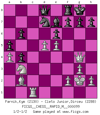 Last move : 1/2-1/2 2018 December 2 13:51:38 [Event "FICGS__CHESS__RAPID_M__000099"] [Site "FICGS"] [Date "2018.11.28"] [Round "1"] [White "Farnik,Kym"] [Black "Cleto Junior,Dirceu"] [Result "1/2-1/2"] [WhiteElo "2130"] [BlackElo "2288"] 1.Nf3 d5 2.d4 Nf6 3.c4 e6 4.g3 dxc4 5.Bg2 a6 6.O-O b5 7.Ne5 Nd5 8.b3 cxb3 9.a4 b4 10.e4 Nf6 11.Bb2 Bb7 12.Nd2 Nbd7 13.Nec4 a5 14.Re1 Nb6 15.Nxb6 cxb6 16.Nxb3 Nd7 17.Rc1 Bd6 18.e5 Bxg2 19.Kxg2 Be7 20.d5 Rc8 21.Qg4 Rxc1 22.Rxc1 O-O 1/2-1/2 Reti Opening Kingside Castling by player White (move 6) Kingside Castling by player Black (move 22) This chess game ended in a draw. Follow this game move after move (download)No one ever won a game by resigning. (Unknown) Ich bin Weltmeister und muß mit niemandem irgend etwas diskutieren. (Viswanathan Anand) Por la belleza de sus partidas, la claridad de su juego y lo brillante de sus ideas, Fischer se creó el mismo como un artista de la misma estatura como Brahms, Rembrandt y Shakespeare. (David Levy) Les Echecs ne sont pas pour les âmes timides. Ils requièrent un homme entier, qui ne s'arrête pas aveuglément à ce qui a été déjà établi, mais qui tente individuellement de sonder les profondeurs du jeu. (W. Steinitz) The smarter you play, the luckier you'll be. (Mark Pilarski)