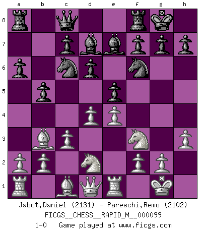 Last move : 1-0 2019 February 12 8:19:19 [Event "FICGS__CHESS__RAPID_M__000099"] [Site "FICGS"] [Date "2018.11.28"] [Round "1"] [White "Jabot,Daniel"] [Black "Pareschi,Remo"] [Result "1-0"] [WhiteElo "2131"] [BlackElo "2102"] 1.e4 e5 2.Nf3 Nc6 3.Bb5 a6 4.Ba4 Nf6 5.O-O Be7 6.Re1 b5 7.Bb3 O-O 8.h3 d6 9.c3 Bd7 10.d4 Qc8 11.Nbd2 1-0 This chess game has been lost on time (started : 2018.11.28 2:50:38) Ruy Lopez : Closed, 7...O-O Kingside Castling by player White (move 5) Kingside Castling by player Black (move 7) Player White won this chess game. Follow this game move after move (download)He who takes the Queen's Knight's Pawn will sleep in the streets. (Anonymous) Ich könnte leicht behaupten: Ja,ja, Leonid Breschnew wollte nicht, daß ich Weltmeister werde. In der Tat war die Sache komplizierter. (Viktor Kortschnoi) El Ajedrez no es como la vida... ¡tiene reglas!. (Mark Pasternak) Si le désir cupide (et stupide) de gagner est une inépuisable source de souffrance, une combinaison brillante sur l'échiquier est une découverte : le coquelicot qui s'épanouit lorsque apparaît la Voie Lactée. (Arrabal) Gambling is the son of avarice and the father of despair. (French proverb)